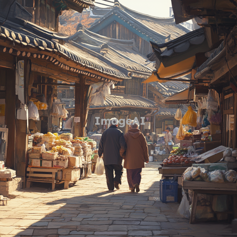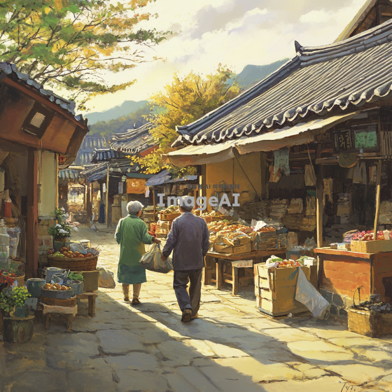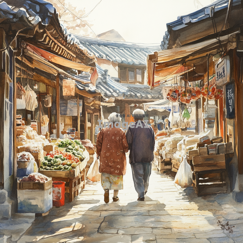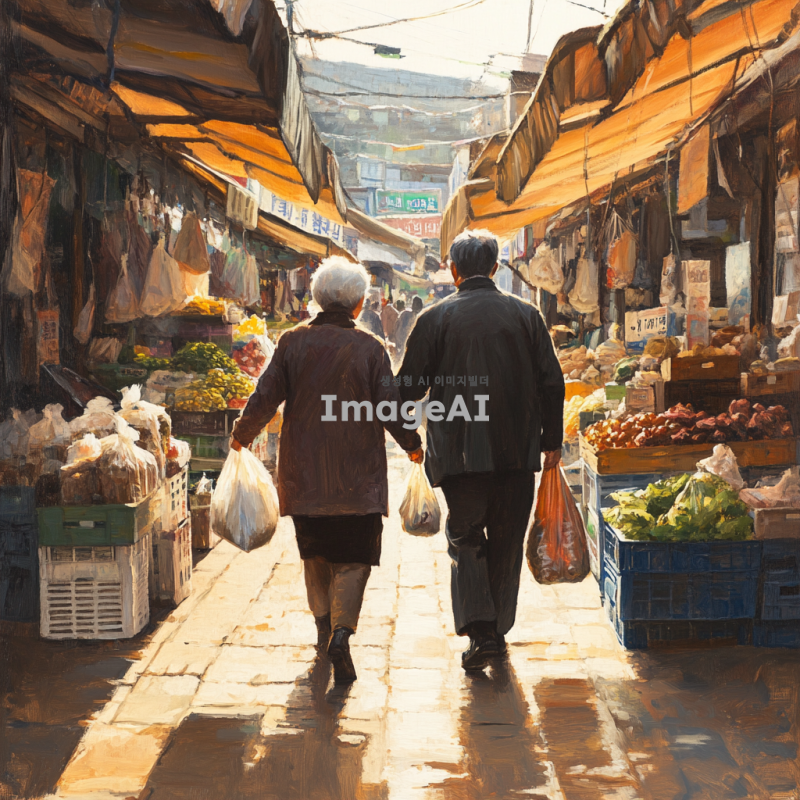 조용한 아침 햇살이 비치는 한국 전통 시장, 할머니와 할아버지께서 시장 물품을 들고 다정하게 정면에서 걸어오는 모습, 따뜻하고 평화로운 분위기, 시장의 활기와 정겨운 느낌, 자연스러운 색감과 디테일이 살아있는 장면.