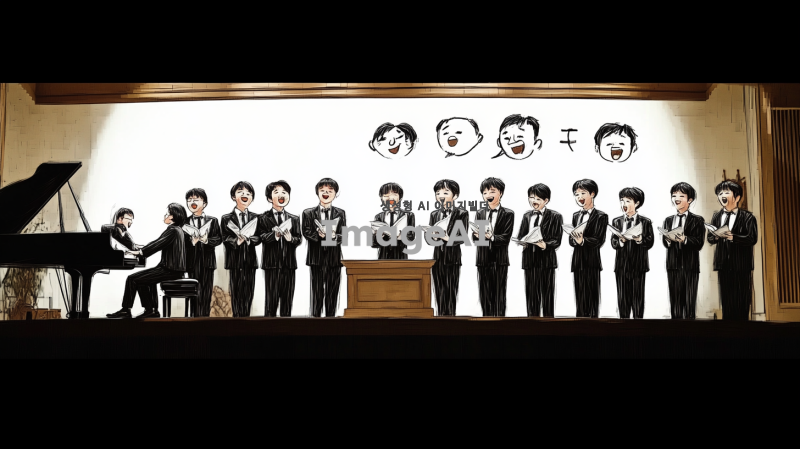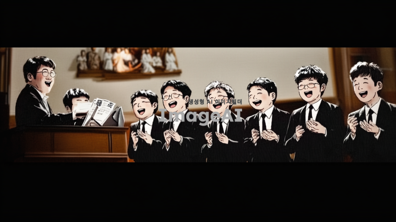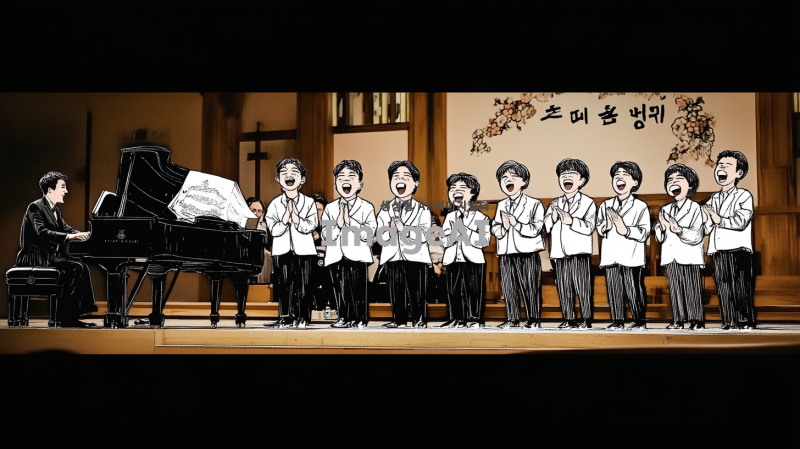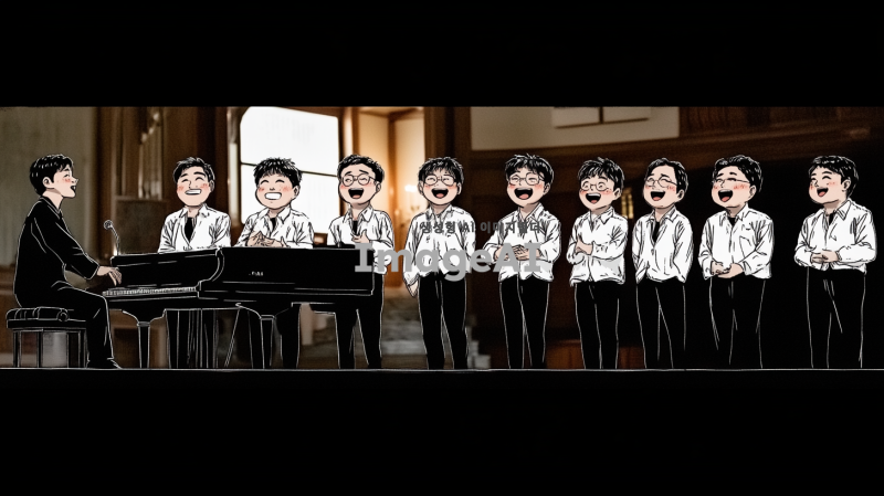 10명의 40대 한국인 남성으로 구성된 합창단이 무대 위에서 유머러스하게 노래하는 장면. 각 인물의 얼굴은 첨부된 이미지의 인물들 체형, 헤어스타일, 복장을 최대한 비슷하게 반영. 합창단의 제일 왼쪽에는 피아노를 치고 있는 반주자가 있으며, 반주자는 집중하며 피아노를 연주하는 모습. 무대는 클래식한 분위기의 교회 내부 단상으로, 조명이 부드럽게 비추고 있는 장면.
