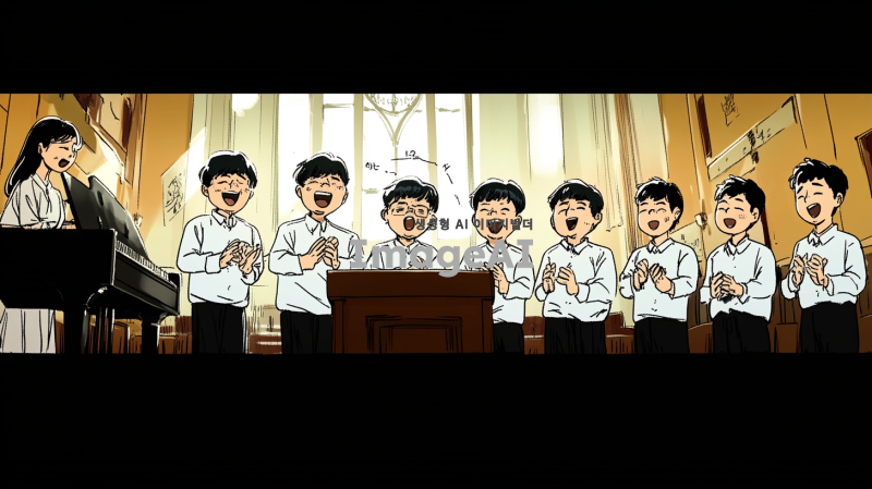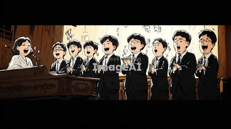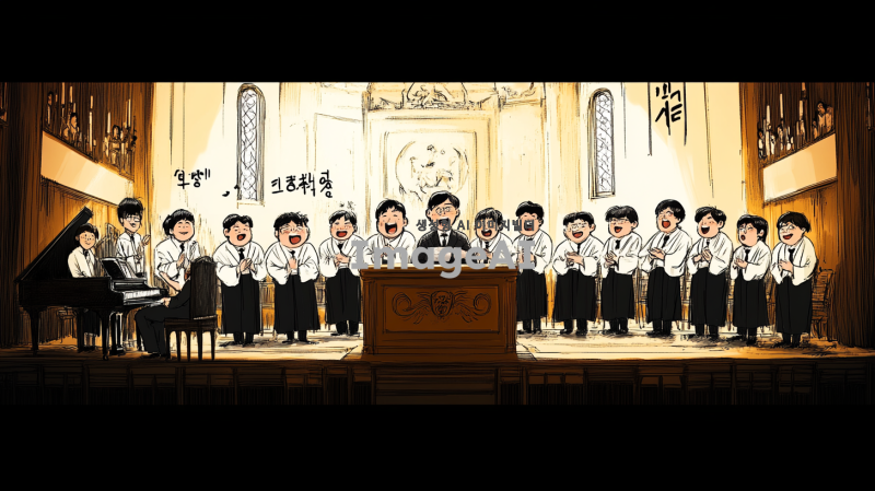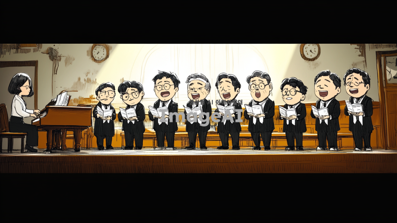 클래식한 분위기의 교회 내부 단상 위에서 10명의 50대 한국인 남성으로 구성된 합창단이 유머러스하게 노래하는 장면. 각 인물은 첨부된 이미지의 인물들 체형, 헤어스타일, 복장을 최대한 비슷하게 표현. 합창단의 제일 왼쪽에는 여자 반주자가 피아노를 치고 있으며, 집중하며 연주하는 모습. 무대에는 부드러운 조명이 비추고 있으며, 전체적인 구도와 인물 구성은 첨부된 이미지와 유사하게 표현.