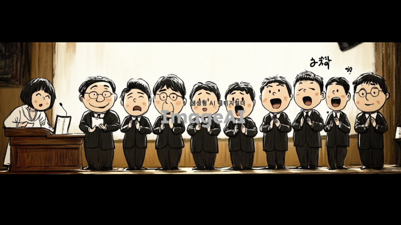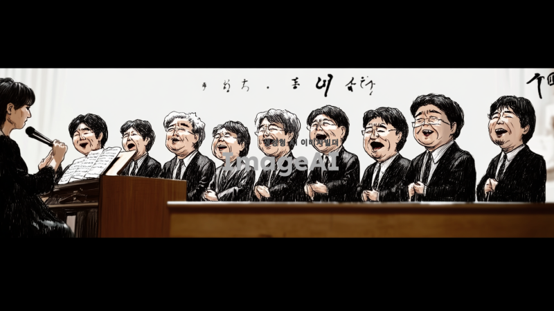 무대 위에서 노래하는 10명의 50대 한국인 남성 합창단, 각 인물의 얼굴과 체형, 헤어스타일, 복장은 첨부된 이미지의 인물들과 유사하게 유머러스하게 표현됨. 합창단의 제일 왼쪽에는 피아노를 치고 있는 여자 반주자가 있으며, 그녀는 집중하며 피아노를 연주하는 모습. 무대는 클래식한 분위기의 교회 내부 단상으로 구성되어 있으며, 부드러운 조명이 비추고 있음. 전체적인 구도와 인물 구성은 첨부된 이미지와 유사하게 반영됨.