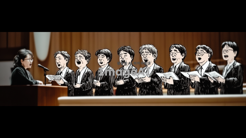 10명의 50대 남성으로 구성된 합창단이 무대 위에서 노래하고 있는 장면, 각 인물의 얼굴은 첨부된 이미지의 인물들 체형과 헤어스타일과 복장 등 특징이 최대한 비슷하게 반영하여 유머러스하게 표현됨. 합창단의 제일 왼쪽에는 피아노를 치고 있는 여자 반주자가 있으며, 반주자는 집중하며 피아노를 연주하는 모습. 무대는 클래식한 분위기의 교회 내부 단상으로 이루어져 있으며, 조명이 부드럽게 비추고 있음. 이미지의 전체적인 구도와 인물 구성은 첨부된 이미지와 최대한 비슷하게 반영함.