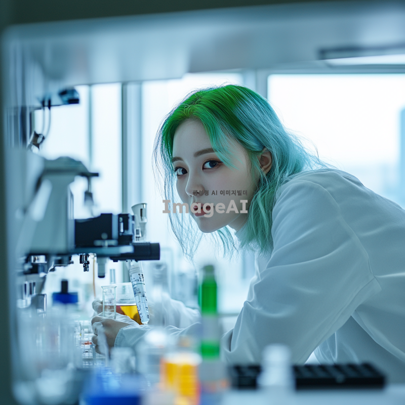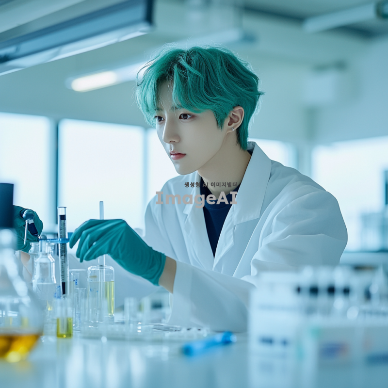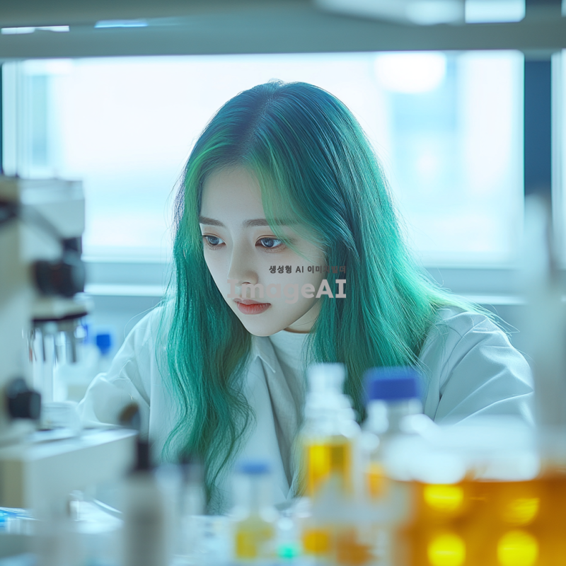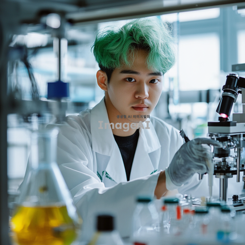초록색 머리를 가진 한국인 과학자가 실험실에서 화학 실험을 하고 있는 모습. 실험실은 최신식 장비로 가득 차 있으며, 과학자는 흰색 실험 가운을 입고 있다. 과학자의 얼굴에는 호기심과 집중력이 가득하며, 실험대 위에는 다양한 화학 약품과 실험 도구들이 놓여 있다. 배경은 깨끗하고 밝은 분위기로, 창문을 통해 자연광이 들어와 실험실을 환하게 비추고 있다.