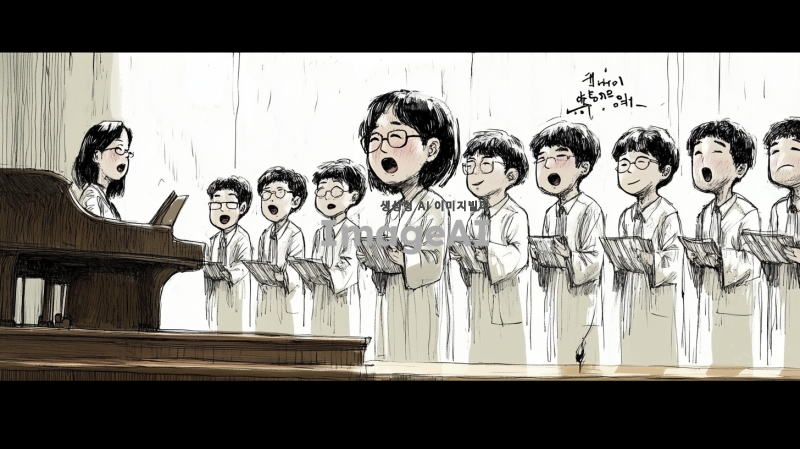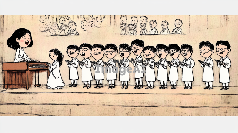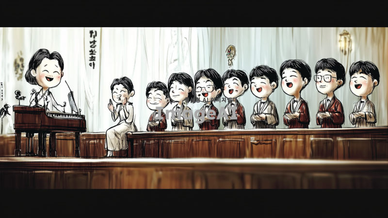 무대 위에서 노래하는 10명의 40대 한국인 남성 합창단을 캐리커처 스타일로 그린다. 각 인물의 얼굴과 체형, 헤어스타일, 복장은 첨부된 이미지의 인물들과 유사하게 유머러스하게 표현한다. 합창단의 제일 왼쪽에는 피아노를 치고 있는 여자 반주자가 있으며, 그녀는 집중하며 피아노를 연주하는 모습이다. 피아노 반주자의 얼굴과 체형, 헤어스타일, 복장도 첨부된 이미지와 최대한 비슷하게 표현한다. 무대는 클래식한 분위기의 교회 내부 단상으로 구성되어 있으며, 부드러운 조명이 비추고 있다. 전체적인 구도와 인물 구성은 첨부된 이미지와 유사하게 반영한다.