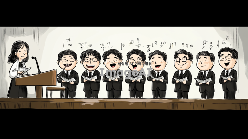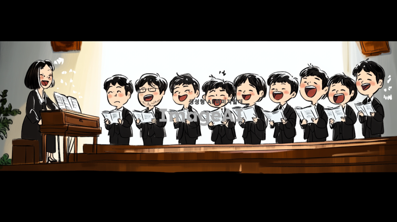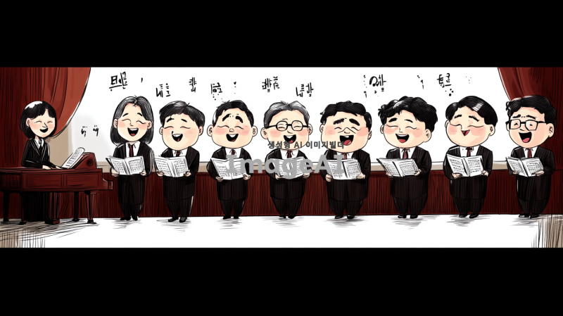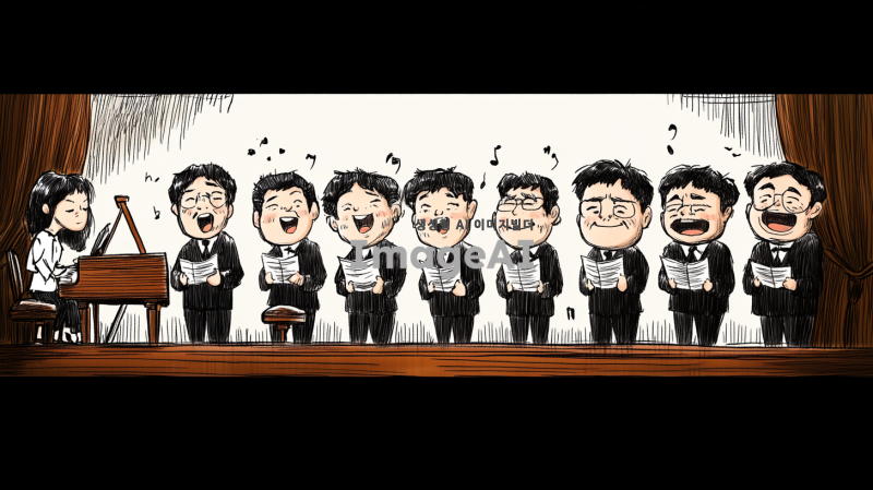 무대 위에서 노래하는 10명의 40대 한국인 남성 합창단을 캐리커처 스타일로 그린다. 각 인물의 얼굴과 체형, 헤어스타일, 복장은 첨부된 이미지의 인물들과 유사하게 유머러스하게 표현한다. 합창단의 제일 왼쪽에는 피아노를 치고 있는 여자 반주자가 있으며, 그녀는 집중하며 피아노를 연주하는 모습이다. 피아노 반주자의 얼굴과 체형, 헤어스타일, 복장도 첨부된 이미지와 최대한 비슷하게 표현한다. 무대는 클래식한 분위기의 교회 내부 단상으로 구성되어 있으며, 부드러운 조명이 비추고 있다. 전체적인 구도와 인물 구성은 첨부된 이미지와 유사하게 반영한다.