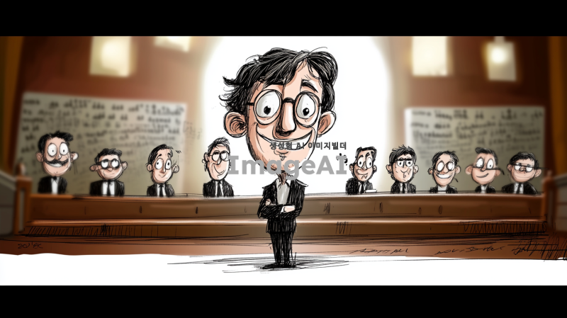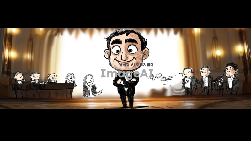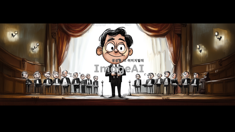 세련되고 완성도 있는 캐리커처 스타일로, 첨부된 이미지의 인물 특징을 최대한 반영하여 유머러스하게 표현. 인물의 얼굴과 자세는 원본 이미지와 비슷하게 유지. 배경은 클래식한 분위기의 교회 내부 단상으로 구성된 무대를 추가하며, 부드러운 조명이 무대를 비추고 있는 장면.