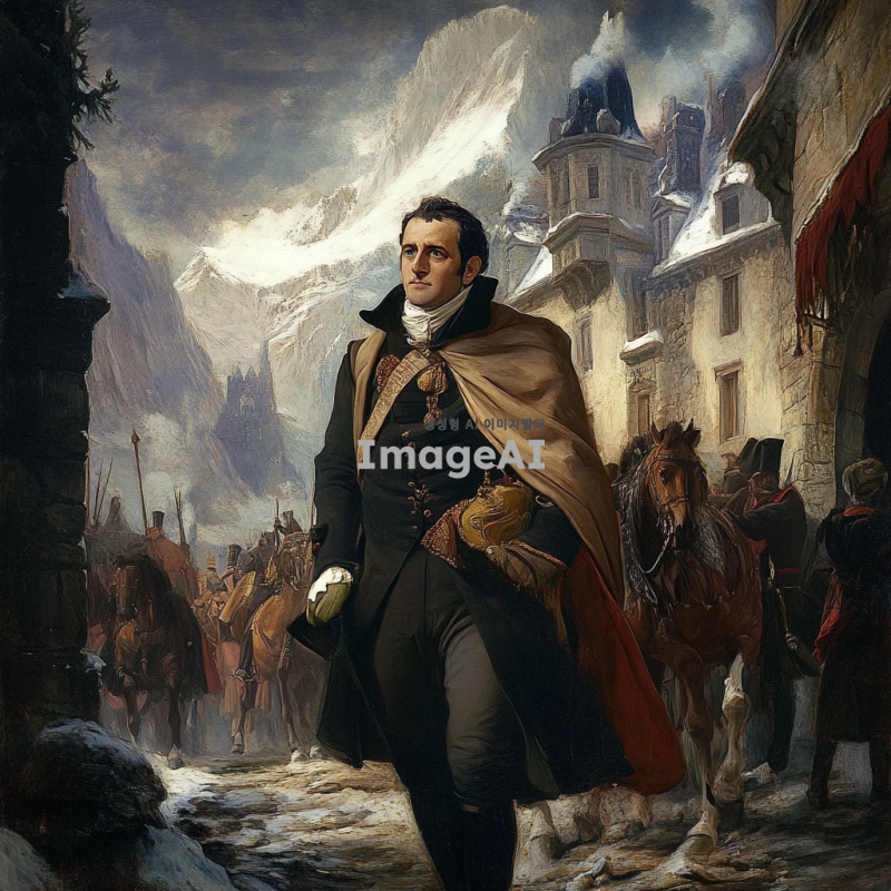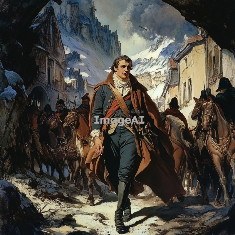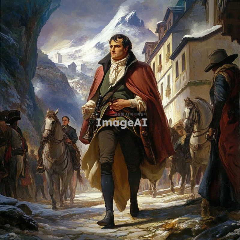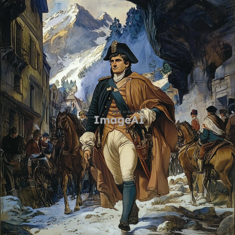 나폴레옹 보나파르트가 평범한 한 사람으로 변신한 모습, 중세 유럽 거리에서 캐주얼한 옷차림으로 걷고 있는 장면, 주변에는 중세적인 건물과 사람들이 어우러져 있는 풍경, 그의 얼굴은 친근하고 온화한 표정