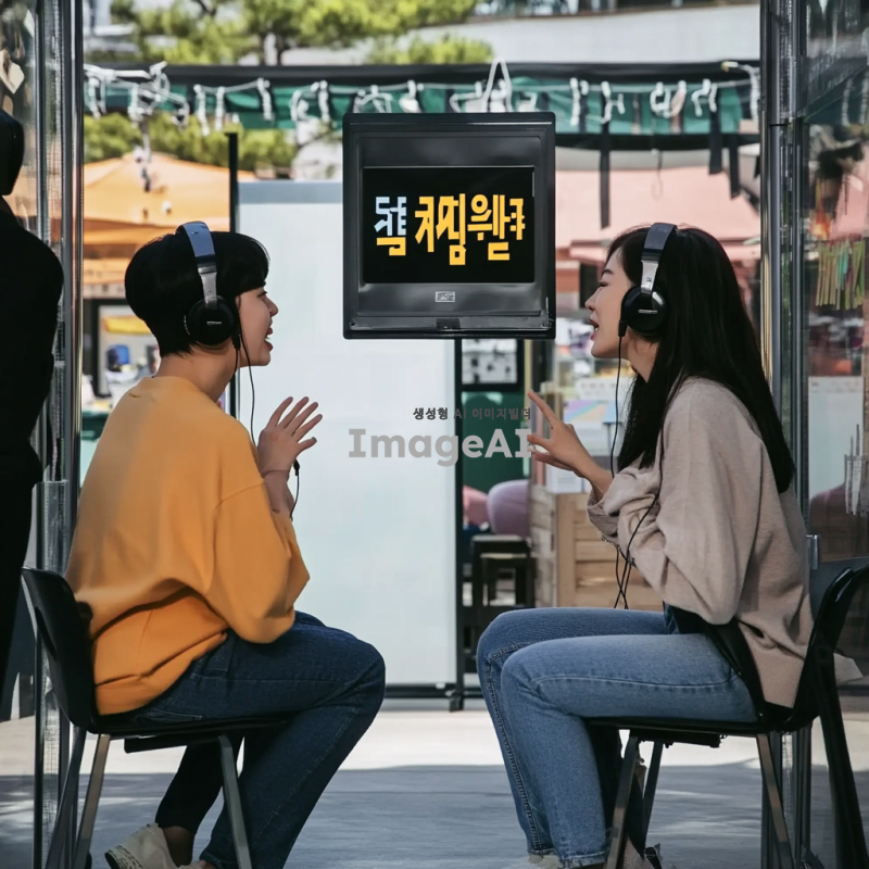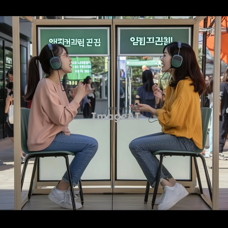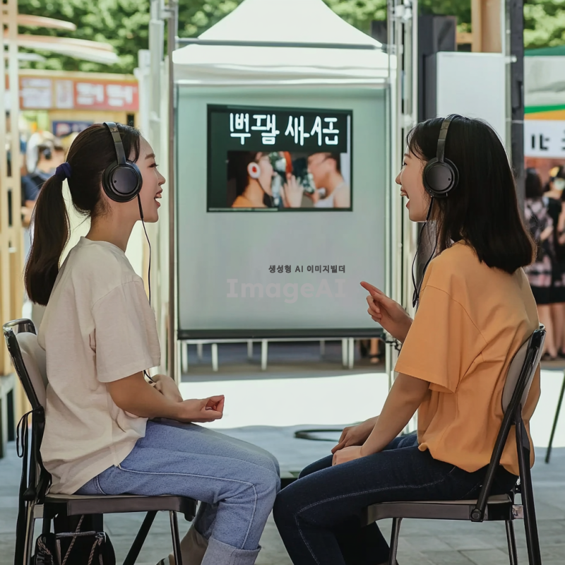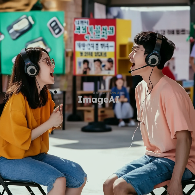 두 명의 한국인, 야외 부스 안 의자에 앉아, 헤드셋 착용, 서로 마주보고 앉아 대화하는 모습, 생동감 있는 표정, 큰소리로 말하는 듯한 입 모양, 야외 축제 배경, 그들이 재밌는 듯 쳐다보는 분위기, 자연광, 캐주얼한 복장.
