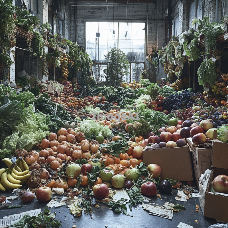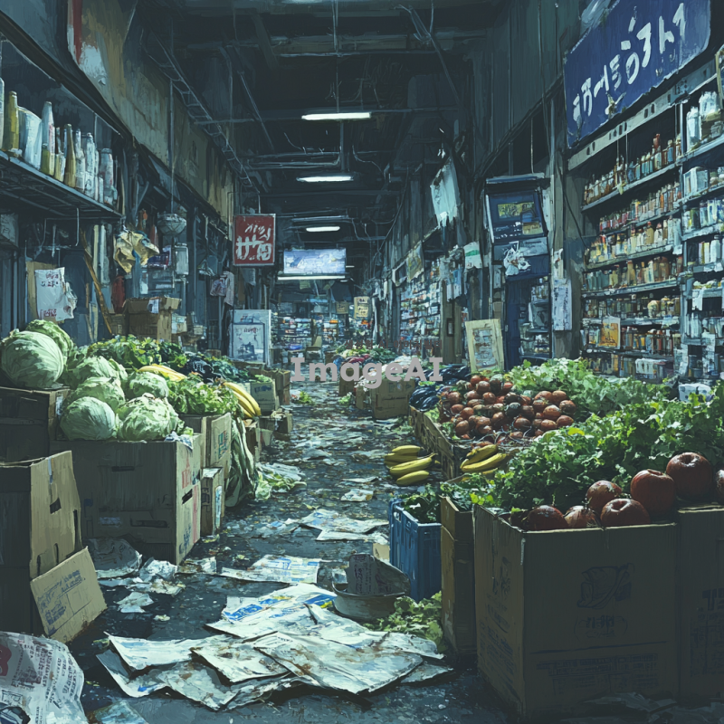 식료품 창고에서 상한 채소와 과일이 진열된 모습, 흐릿한 조명 아래에서 신선하지 않은 사과, 바나나, 상추 등이 놓여 있는 장면, 약간의 곰팡이가 피어 있는 모습과 함께 주변에 지저분한 종이 박스와 신문지가 깔려 있는 장면, 배경은 관리가 잘되어있지 않는 창고의 느낌이 나도록 연출.