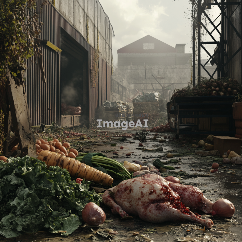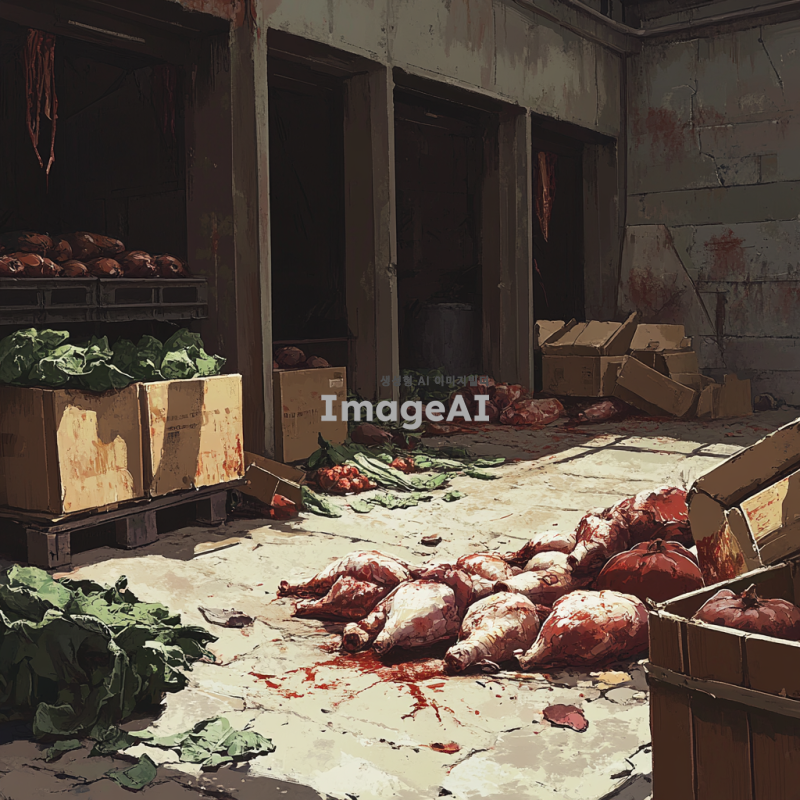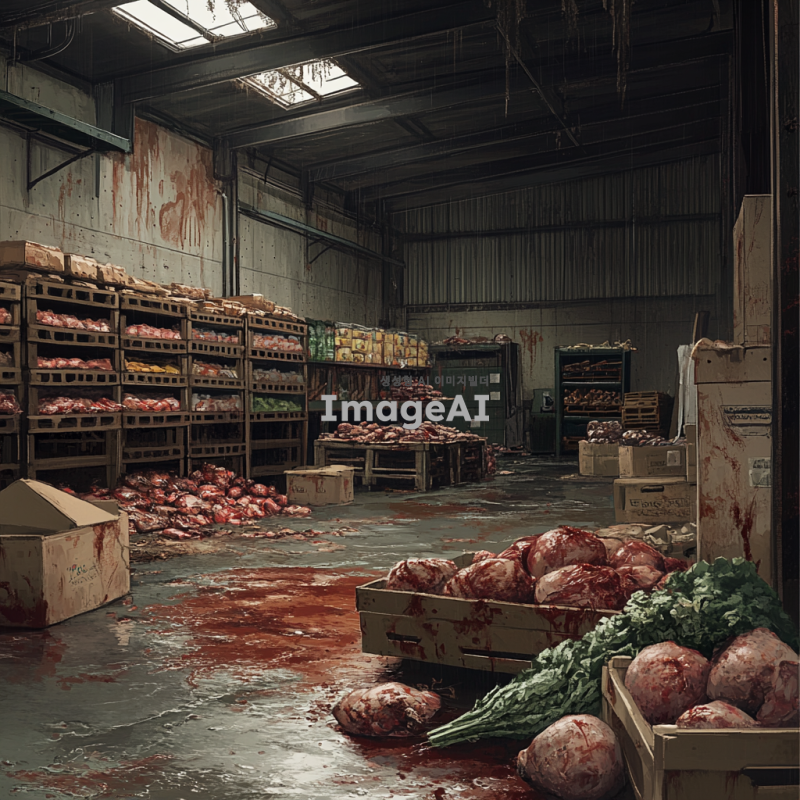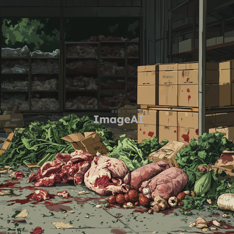 시들고 변색된 야채들과 상해보이는 닭고기와 돼지고기, 배경은 식료품 보관하는 창고. 부패 과정이 잘 드러나지만 일러스트 느낌으로 최대한 단순하며 깔끔한 이미지