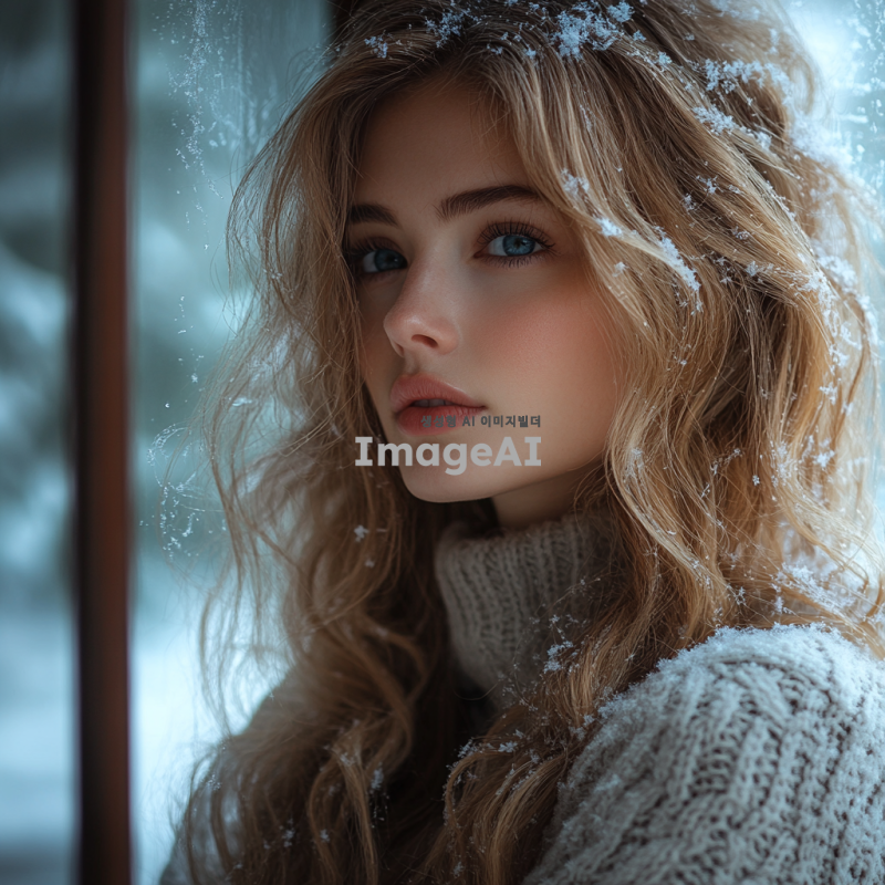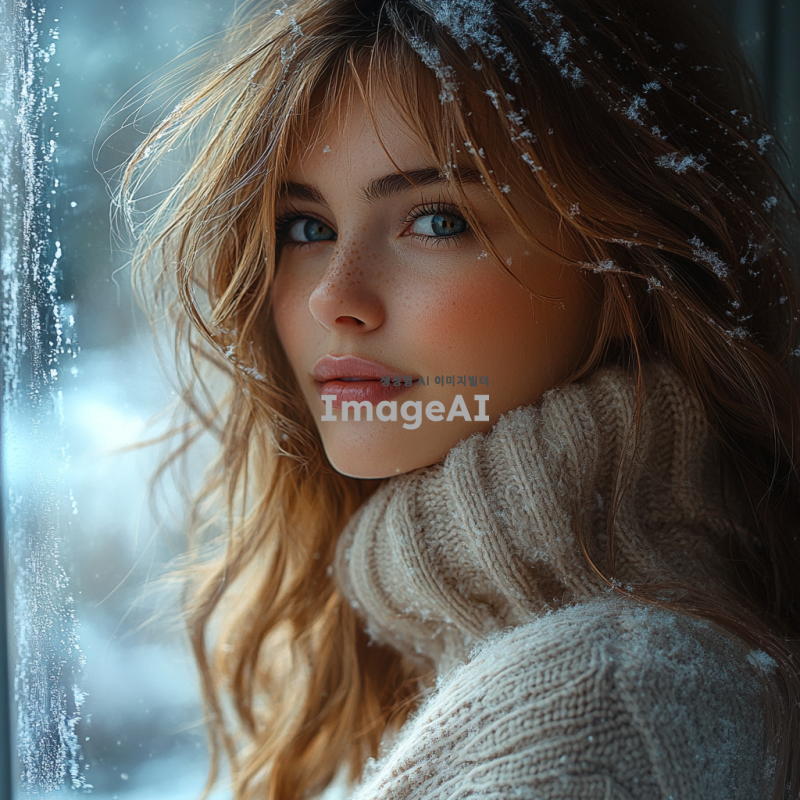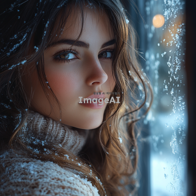 겨울 창밖을 바라보는 소녀, 눈이 내리는 풍경, 창문에 서리가 가득, 소녀의 표정은 깊은 생각에 잠겨 있으며 약간의 슬픔이 느껴짐, 따뜻한 니트 스웨터를 입고 있음, 창문 너머로 보이는 겨울 풍경은 쓸쓸하면서도 아름다움, 방 안은 아늑하고 조용한 분위기, 자연광이 부드럽게 들어오는 장면, 소녀의 긴 머리가 어깨에 흘러내림, 창문에 비친 소녀의 희미한 반영