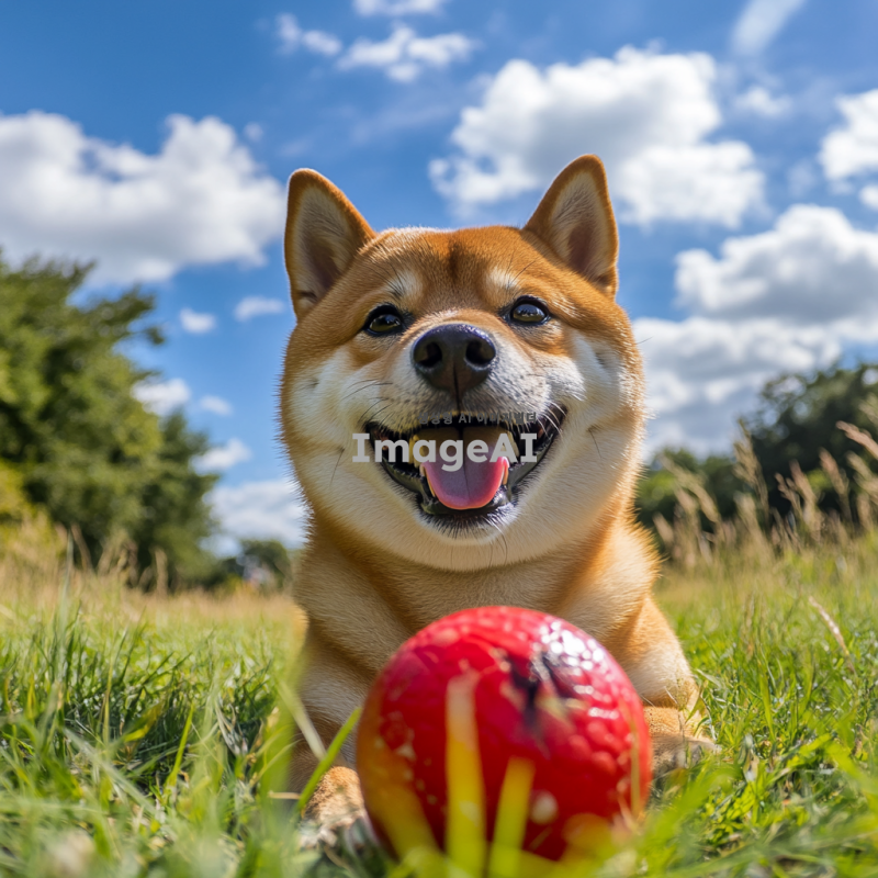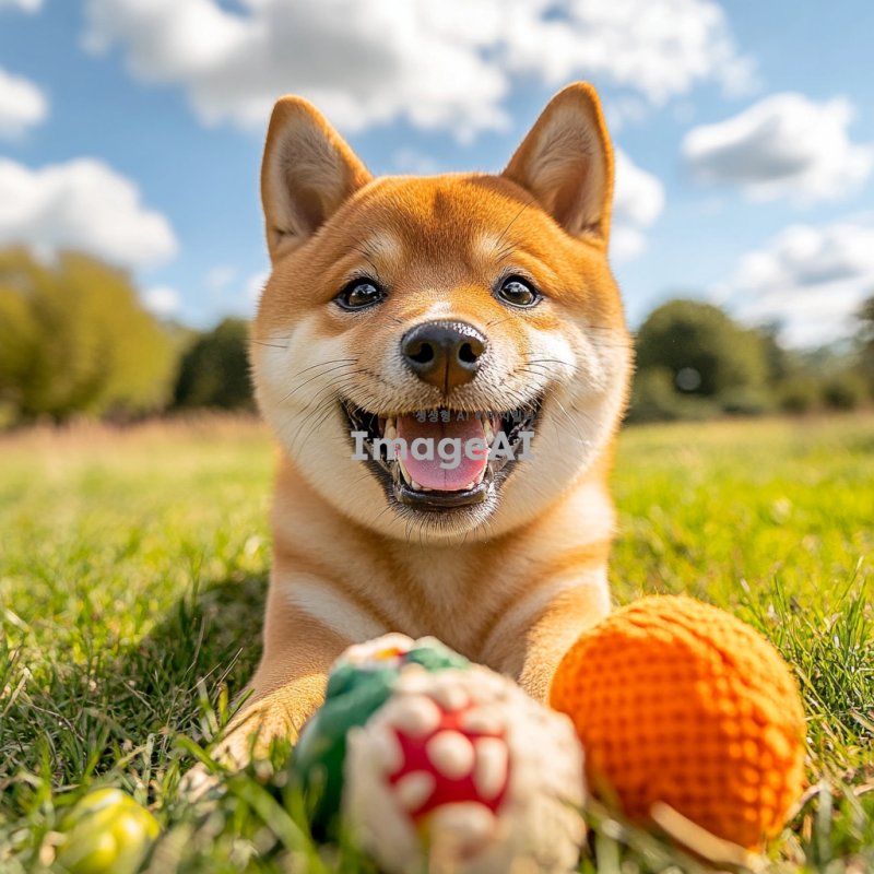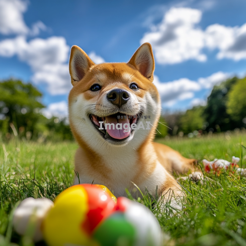 밝은 햇살 아래 공원에서 장난감과 함께 놀고 있는 귀여운 시바견, 부드럽고 윤기 나는 털, 활기찬 표정, 주변에는 푸른 잔디와 나무들, 배경에는 맑은 하늘과 흰 구름.