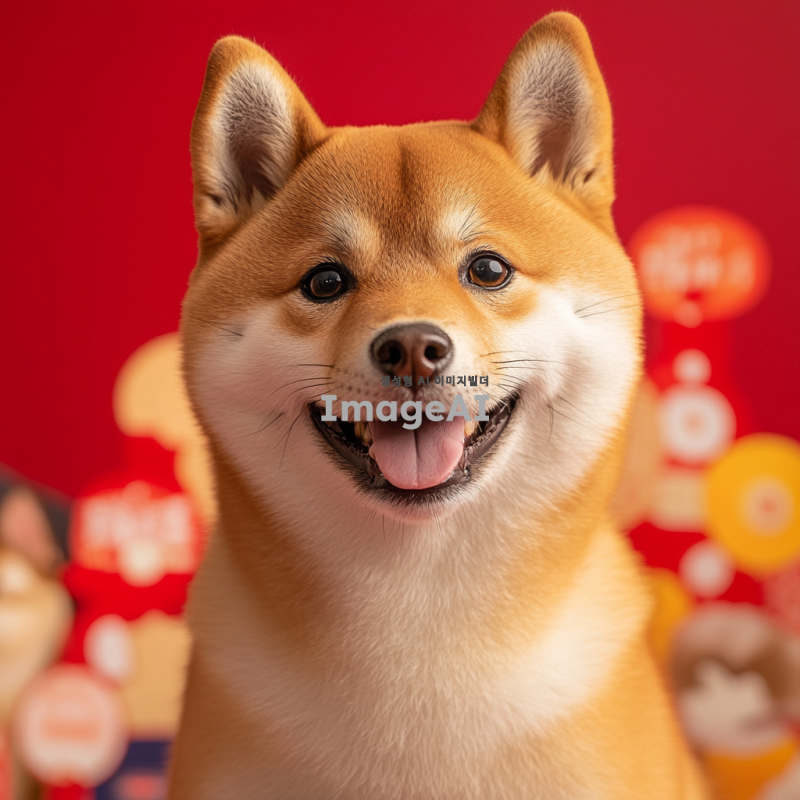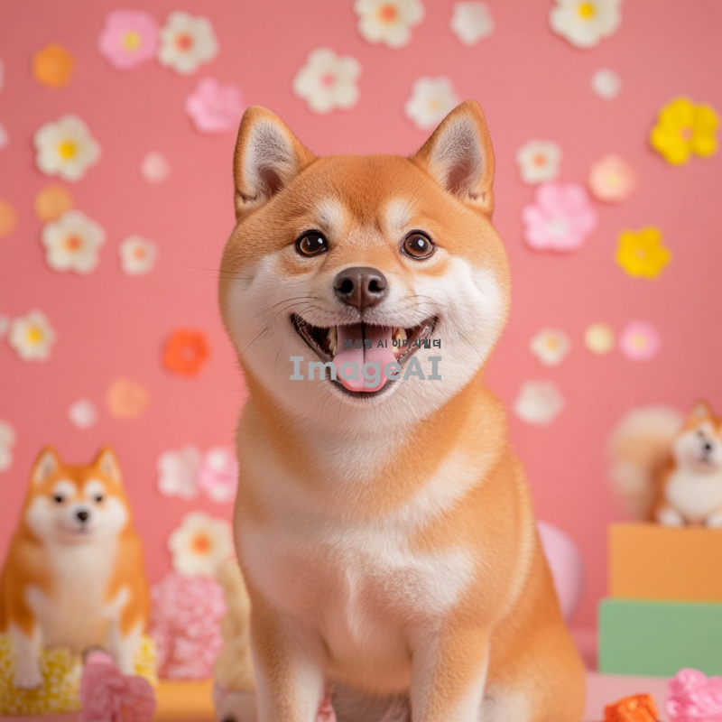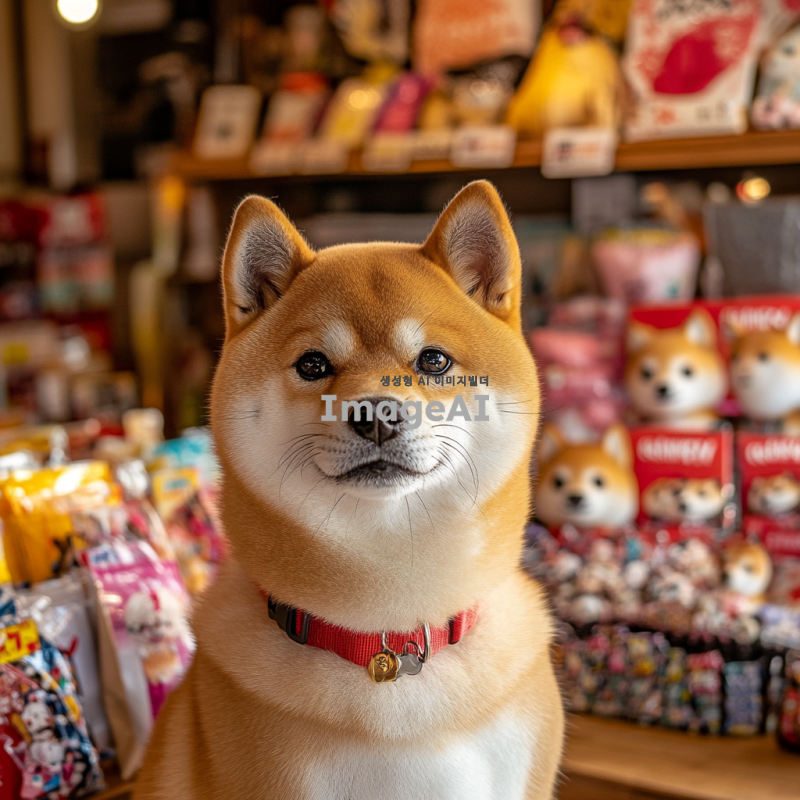 스튜디오에서 찍은 귀여운 시바견과 그 뒤에서 빵빵 터지는 시바견 굿즈상품들