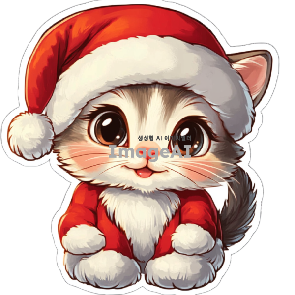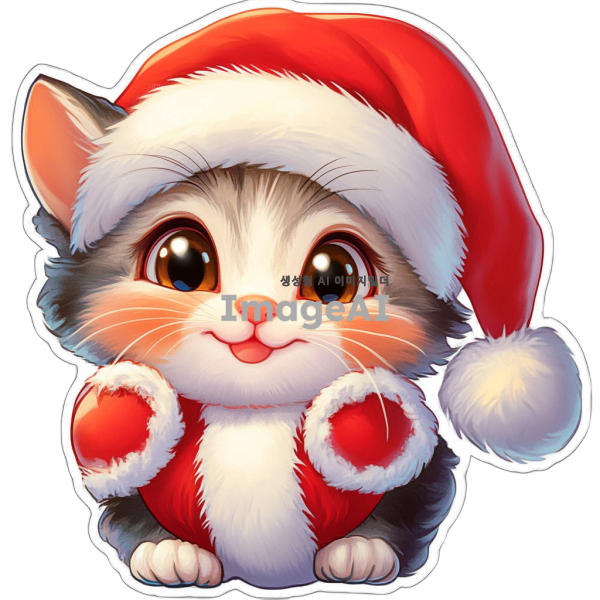 700x700 픽셀 크기의 배경 없는 사랑스럽고 매우 귀여운 실제 아기 고양이 산타 스티커 이미지, 산타 모자를 쓰고 있는 고양이, 부드러운 털과 큰 눈, 귀엽고 장난기 있는 포즈, 밝고 따뜻한 색감, 고양이의 털과 산타 모자의 질감이 잘 드러나도록.