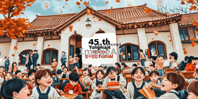 제 45회 용마제 축제 포스터를 위한 이미지: 용마고 강당과 각반 교실을 배경으로, 학생들이 활기차게 꿈을 꾸고 있는 모습을 담은 장면. 학생들이 다양한 분야의 진로를 탐색하며 창의적인 활동을 하는 모습. 배움 중심의 교육을 상징하는 책과 교구들, 소통과 공감이 있는 민주적 학교 문화를 나타내는 학생들의 토론 장면. 안전하고 행복한 학교 환경을 상징하는 밝고 따뜻한 분위기. 학교의 상징성을 드러내는 요소들, 예를 들어 학교 로고나 마스코트. 포스터 중앙에는 "제 45회 용마제 축제"라는 문구가 강조되어 있으며, 한국어로 작성됨. 폭죽이 터지며 축제의 활기와 축하 분위기를 더함. 아름답고 조화로운 색채 조합을 사용하여 밝고 긍정적인 이미지를 연출.