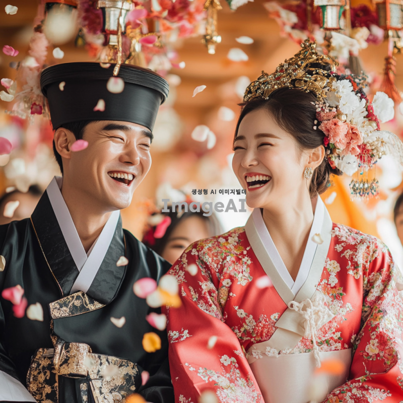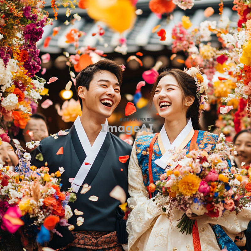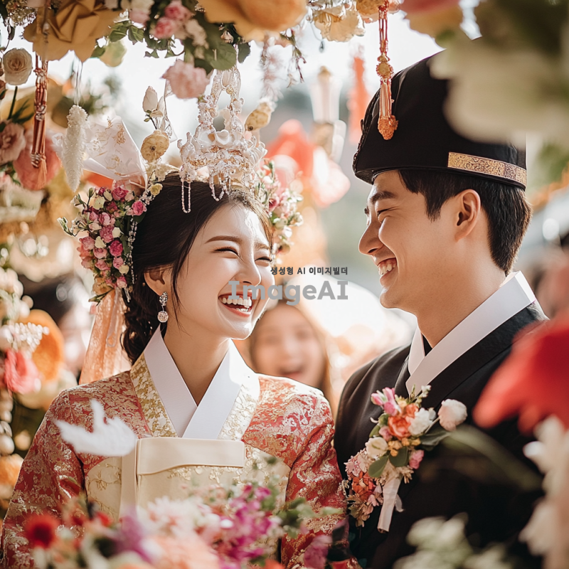 따뜻하고 행복한 분위기의 결혼식 장면, 신랑과 신부가 전통 한복을 입고 환하게 웃고 있는 모습, 주변에는 화려한 꽃 장식과 가족들이 축하하는 장면, 한국 전통 결혼식의 아름다움을 강조, 밝고 환한 색감, 사랑과 기쁨이 가득한 느낌