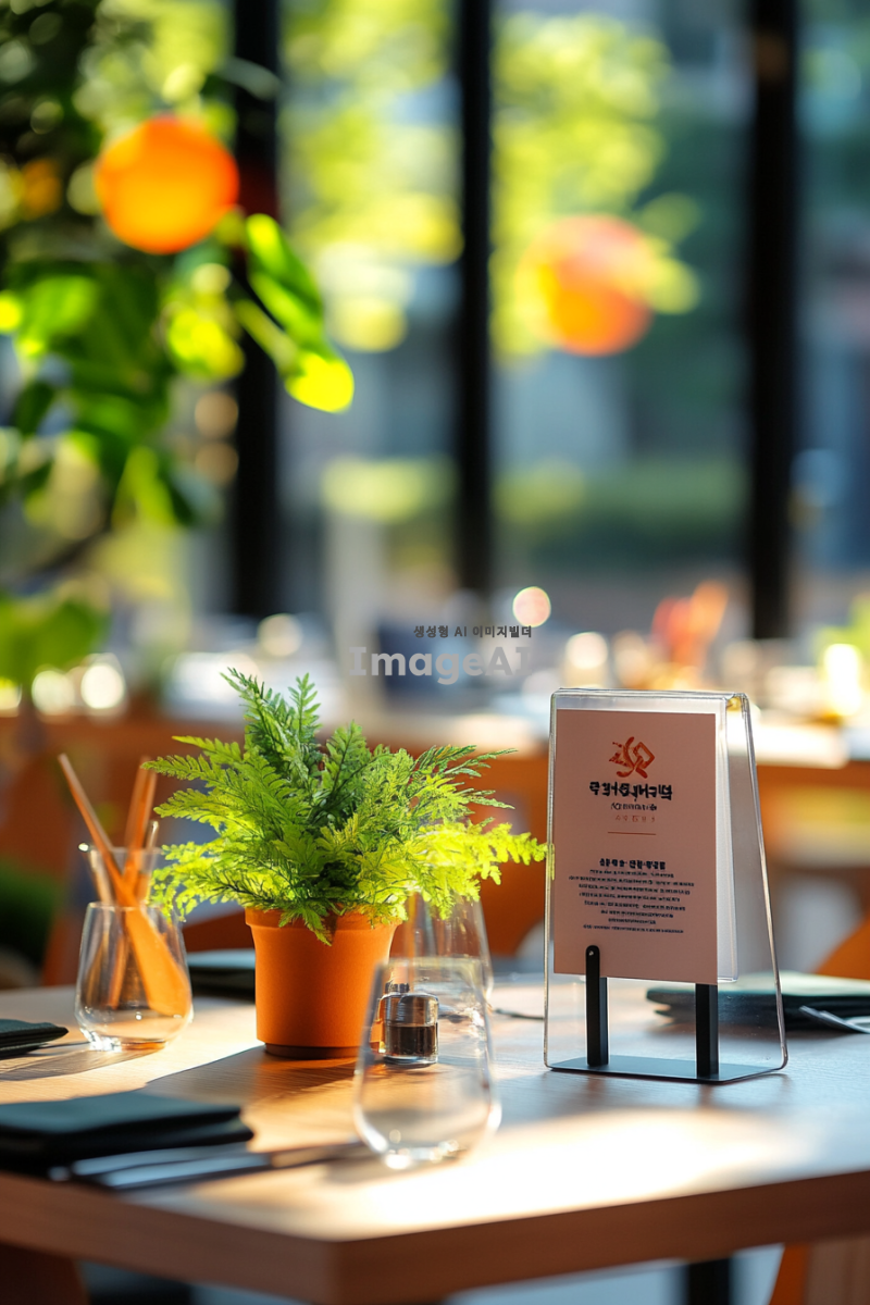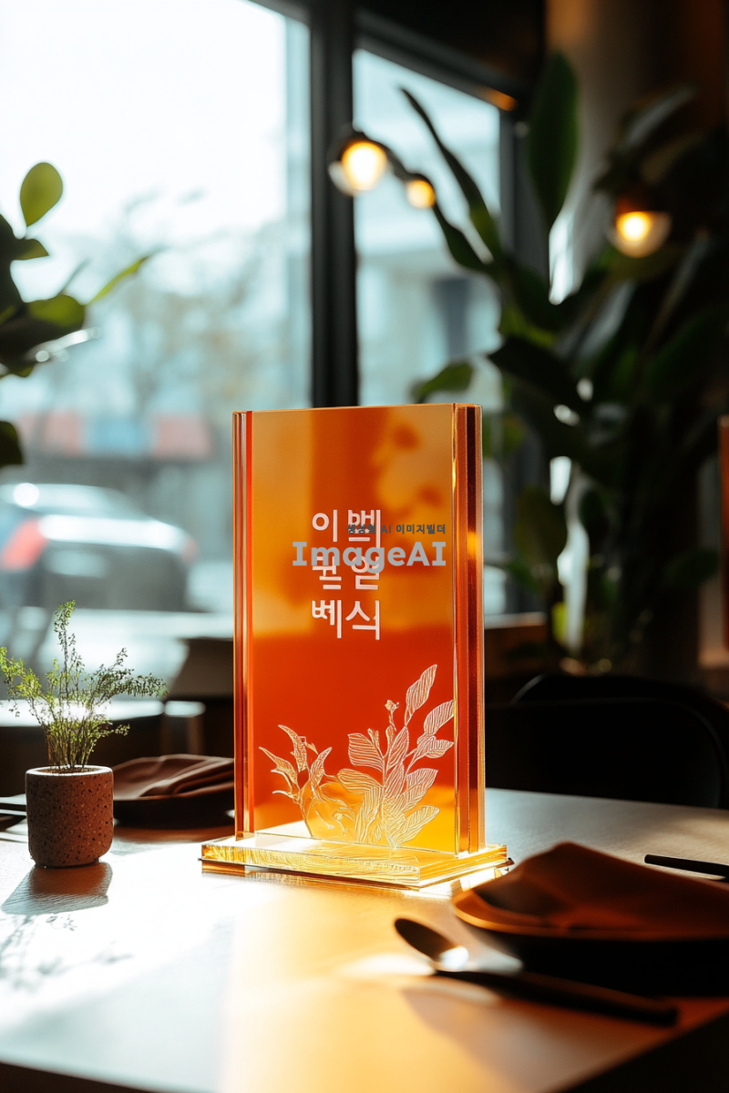 아크릴 미니 입간판 디자인, 테이블 위에 놓인 모습, 현대적이고 세련된 스타일, 반짝이는 아크릴 재질, 깔끔한 타이포그래피, 밝고 생동감 있는 색상, 식당이나 카페의 분위기를 강조하는 요소, 주변에 작은 식물 장식, 따뜻한 조명 아래의 분위기, 한국적 미적 요소 포함.