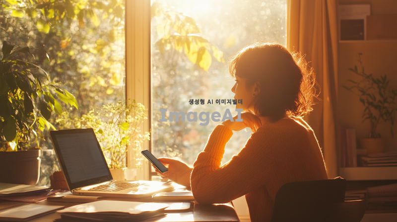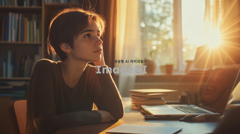 단발머리를 한 여학생이 피곤한 얼굴로 책상에 앉아 스마트폰을 내려놓고 있다. 창 밖으로는 아침 햇살이 밝게 비추며, 그녀는 창 밖을 바라보고 있다. 방 안에는 따뜻한 색감의 아침 햇살이 스며들어 있으며, 책상 위에는 노트북과 책들이 어지럽게 놓여 있다. 여학생의 눈에는 살짝 피곤함이 묻어나지만, 창 밖을 바라보는 모습은 평화롭다. 4K 해상도로 생생하게 표현된 아침의 분위기와 여학생의 섬세한 표정이 돋보인다.