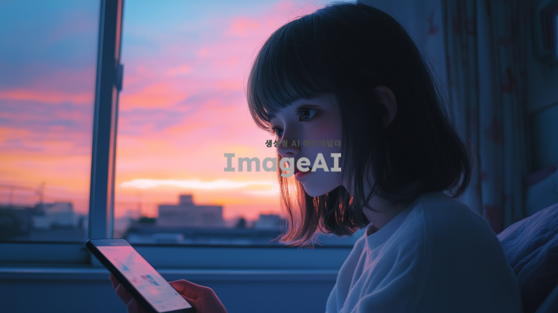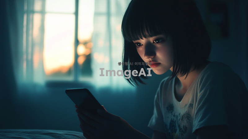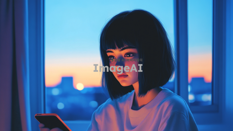 단발머리를 한 여학생이 피곤한 표정으로 다크써클이 가득한 얼굴을 하고 있다. 그녀는 스마트폰을 내려놓고 방 안에 앉아 있으며, 창 밖으로 밝아진 새벽 하늘을 바라보고 있다. 창문 밖으로는 여명이 밝아오는 하늘이 보이며, 방 안은 부드러운 새벽빛으로 은은하게 비추고 있다. 전체적인 색감은 새벽의 차분하고 부드러운 분위기를 반영하며, 4K 해상도로 세밀하게 표현되어 있다.