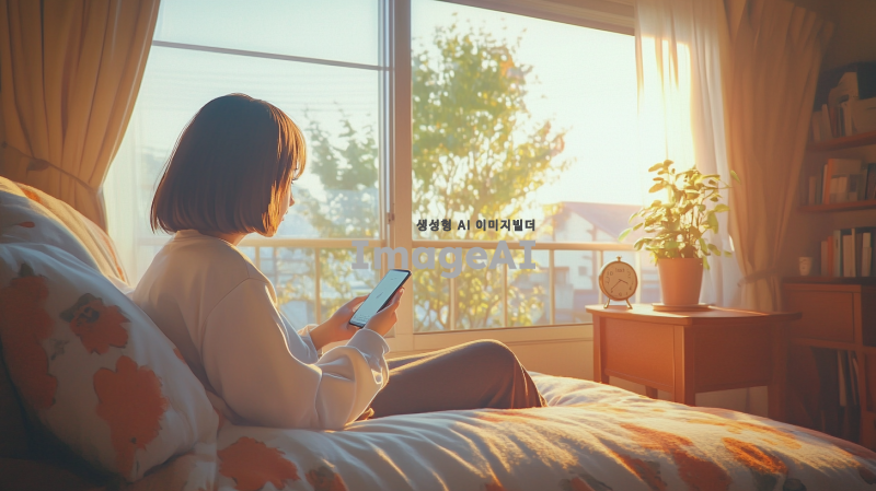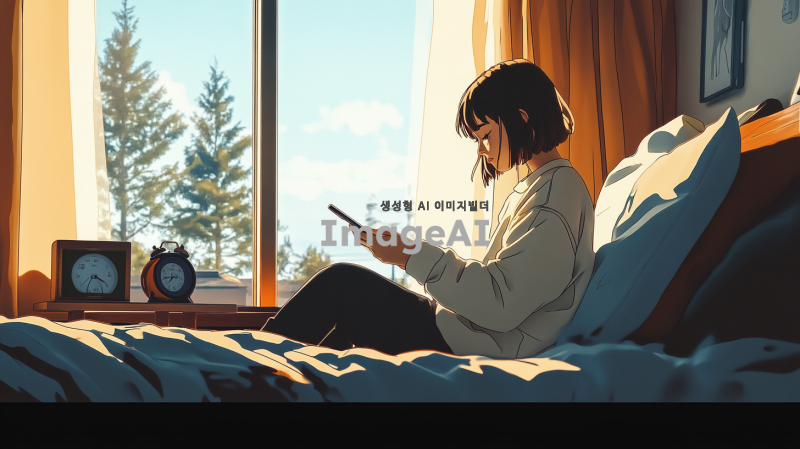 아침 햇살이 창문을 통해 부드럽게 들어오는 방 안, 단발머리를 한 여학생이 침대에 앉아 스마트폰을 들여다보는 모습. 여학생은 파자마를 입고 있으며, 침대 옆에는 작은 탁자와 알람시계가 놓여 있다. 방 안은 아늑하고 따뜻한 느낌으로 꾸며져 있으며, 창밖으로는 맑은 하늘과 나무가 보인다. 4K 해상도의 생생한 디테일로 표현된 장면.