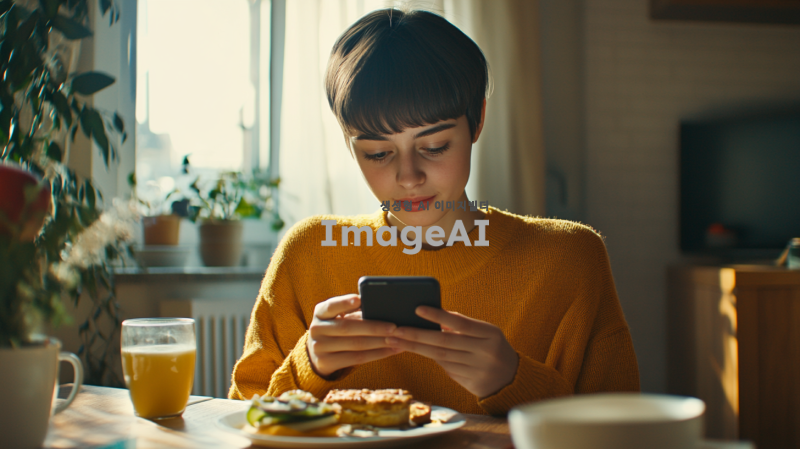 아침식사를 하면서 스마트폰을 집중해서 보고 있는 단발머리 여학생, 식사는 뒷전이고 스마트폰만을 보고있다, 식탁 위에는 간단한 아침식사가 놓여 있고, 창문으로 따스한 아침 햇살이 들어오는 장면, 여학생은 편안한 실내복을 입고 있으며, 주변은 아늑하고 현대적인 주방 인테리어, 4K 해상도, 1920x1080 비율.