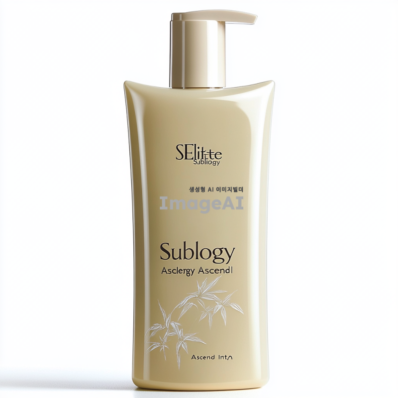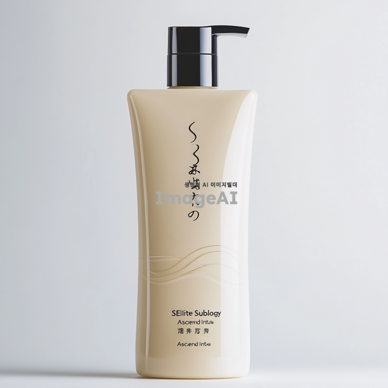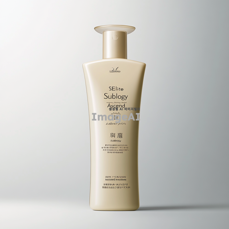 1️⃣ 고급스러운 시세이도 "SElite Sublogy Ascend Intظ" 샴푸는 우아하고 키가 크며 날씬한 병 디자인을 특징으로 하며, 매끄러운 표면이 빛을 아름답게 반사합니다. 샴푸의 전면 라벨은 베이지 색상이며 일본어 문자로 굵게 텍스트가 작성되어 있습니다. 'Sublimic visage aqua intense leave shamic hair'라고 적혀 있습니다. 라벨의 오른쪽 상단 모서리에는 흰색 배경에 미국 뷰티 로고가 작게 있습니다.