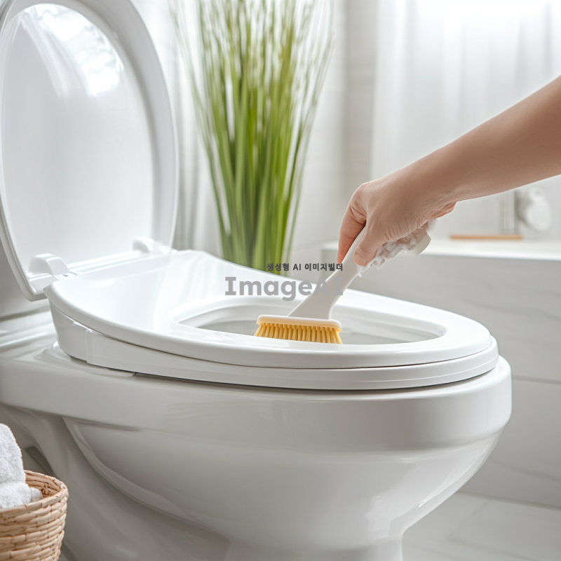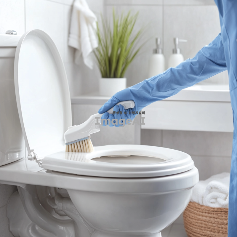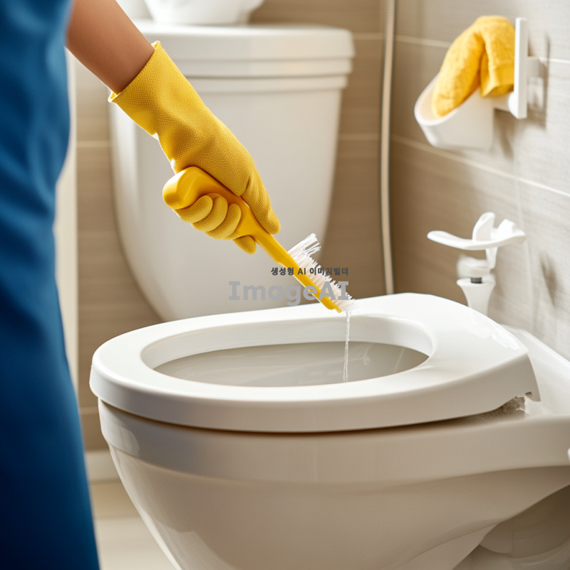 욕실에서 변기를 청소하는 장면, 한국인 청소 전문가가 전용 클리너와 브러시를 사용하여 변기 내부와 외부를 꼼꼼하게 닦고 있는 모습, 변기 뚜껑과 물조절기까지 세심하게 청소하는 장면, 깔끔하고 위생적인 욕실 환경을 강조, 정돈된 청소 도구들이 주변에 배치되어 있는 모습.