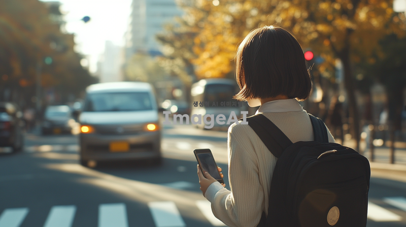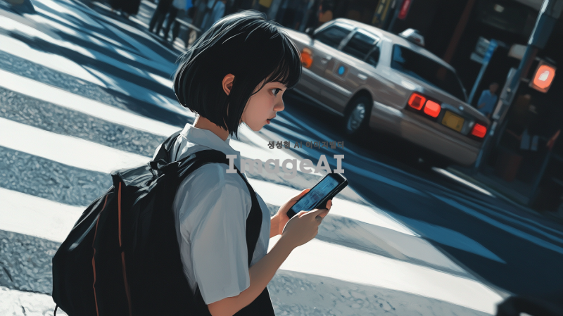등굣길, 교복을 입은 단발머리 한국 여학생, 스마트폰을 보며 길을 건너려는 순간, 빠르게 달려오는 자동차, 긴장감 넘치는 장면, 도시의 아침 분위기, 1920x1080 해상도, 4K 품질, 사실적 스타일, 역동적인 구도, 현실적인 조명과 그림자, 교차로 배경.