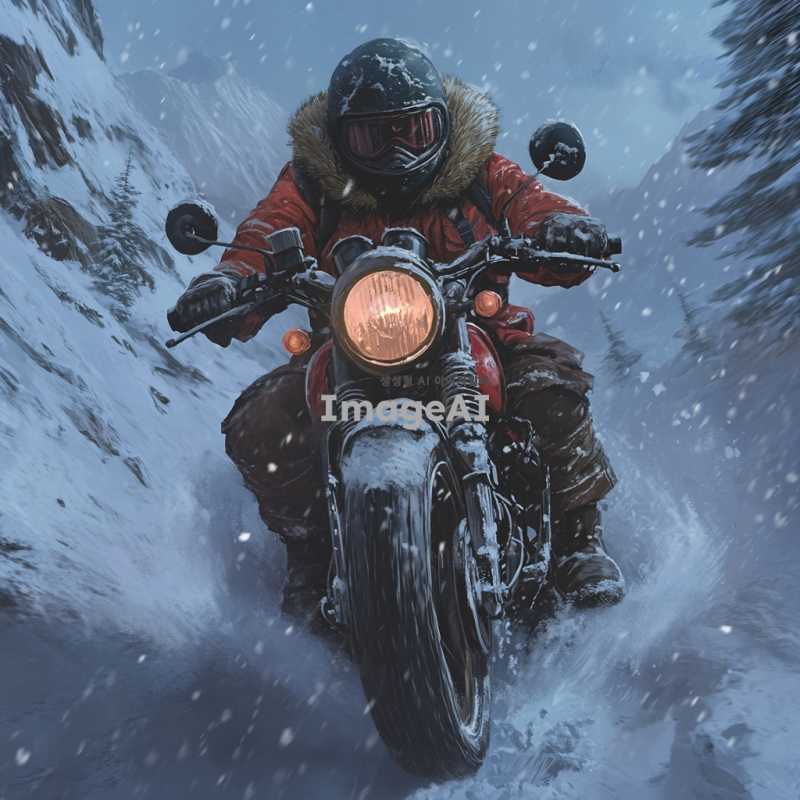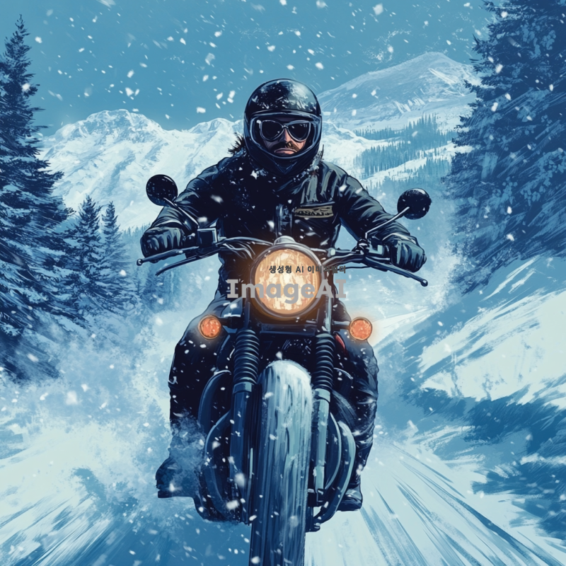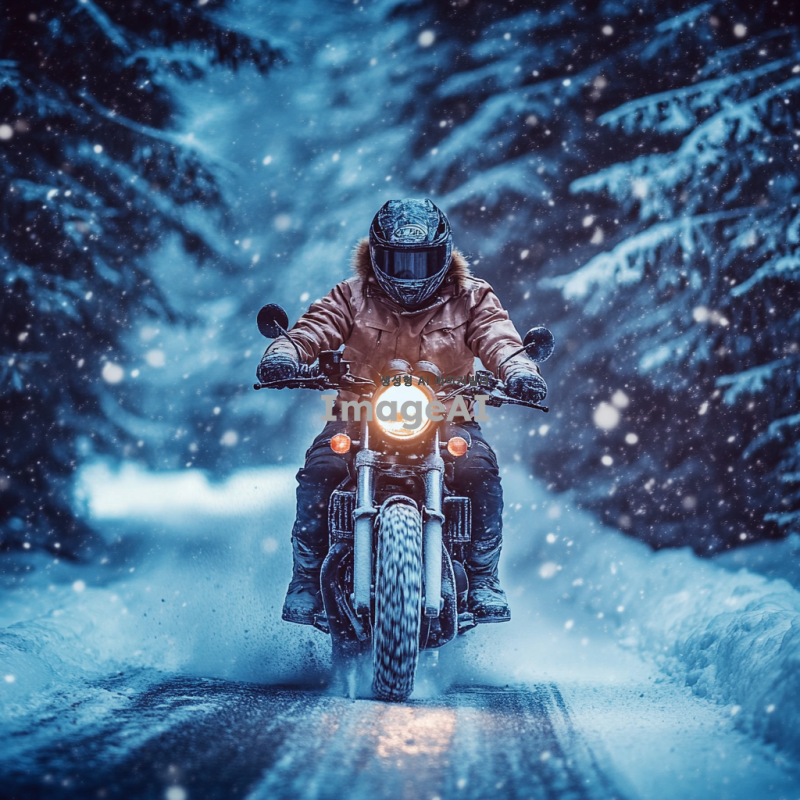 겨울철 눈이 내리는 배경에 오토바이를 타고 있는 사람, 두꺼운 방한복을 입고 헬멧을 쓴 모습, 차가운 바람을 맞으며 눈길을 달리는 상황, 주변에는 눈 덮인 나무와 길이 있으며, 하늘에서 눈송이가 흩날리는 장면, 사람의 표정은 추워보이지만 즐거운 느낌을 주는 모습.