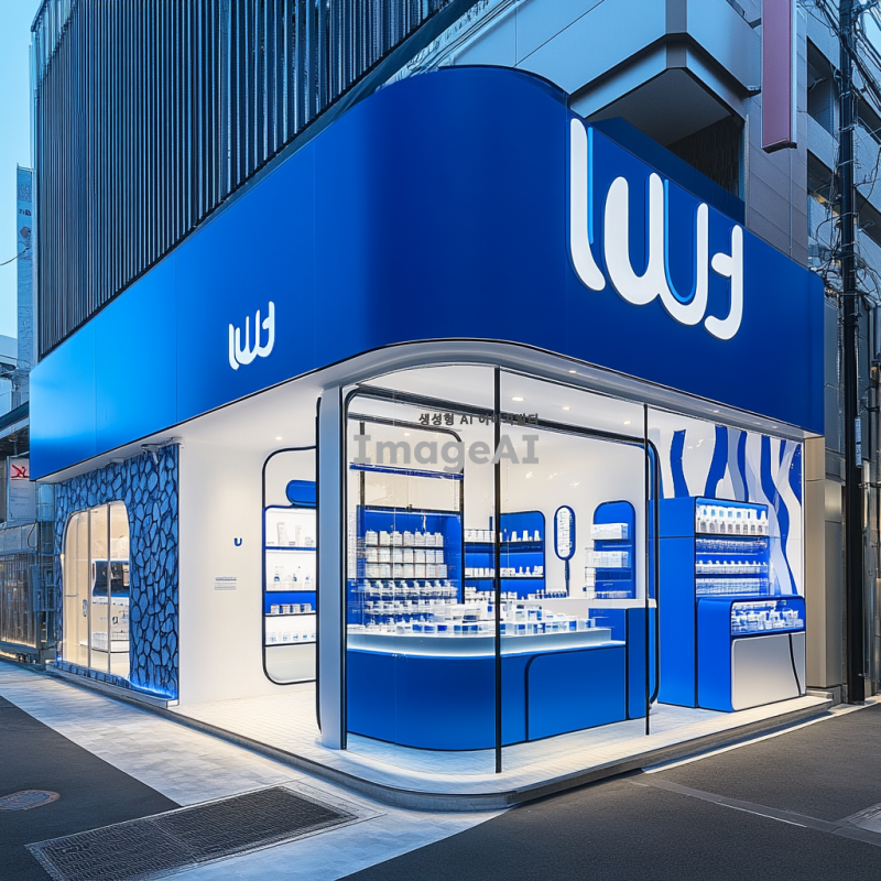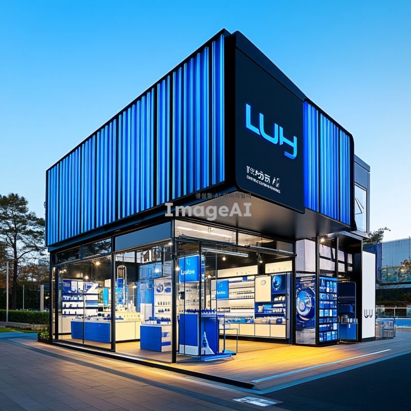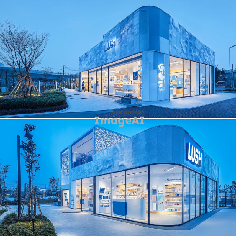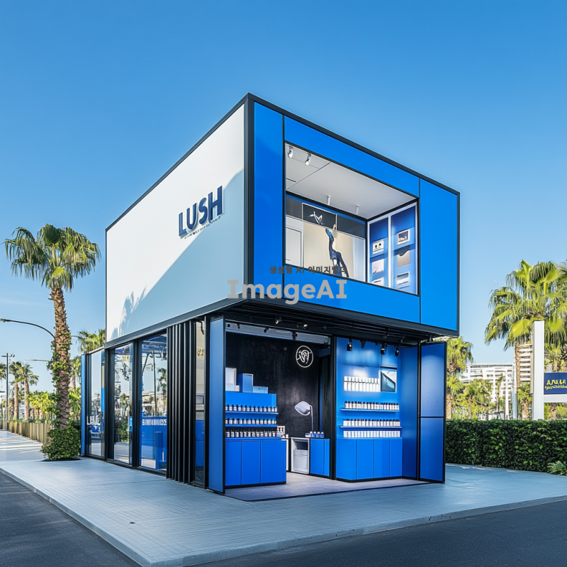 파랑과 흰색을 주조로 한 현대적인 건물 디자인, 화장품 회사인 러쉬와 스포츠 테마를 결합한 팝업스토어. 건물 내부는 축구, 수영, 테니스, 캠핑 등 4가지 스포츠 체험 공간이 조화롭게 배치되어 있으며, 각각의 공간은 해당 스포츠의 특성을 살려 디자인됨. 건물 외관에는 LUSH와 RUSH를 결합한 로고가 파랑과 검정색으로 세련되게 표현되어 있음. 내부에는 깔끔하게 정돈된 캐비닛에 다양한 화장품 제품들이 배치되어 있으며, 방문객들이 자유롭게 체험할 수 있는 공간으로 설계됨.