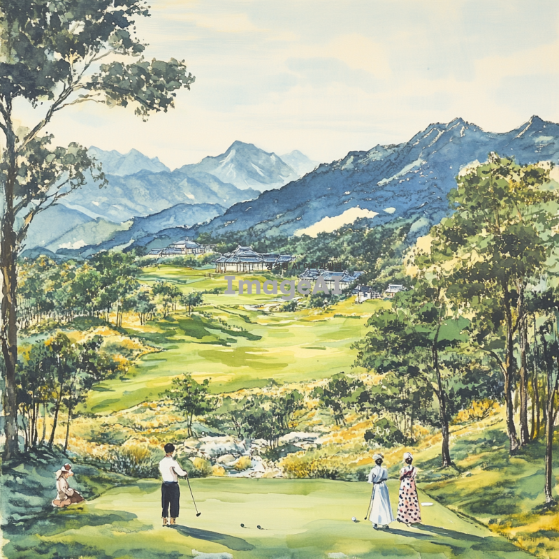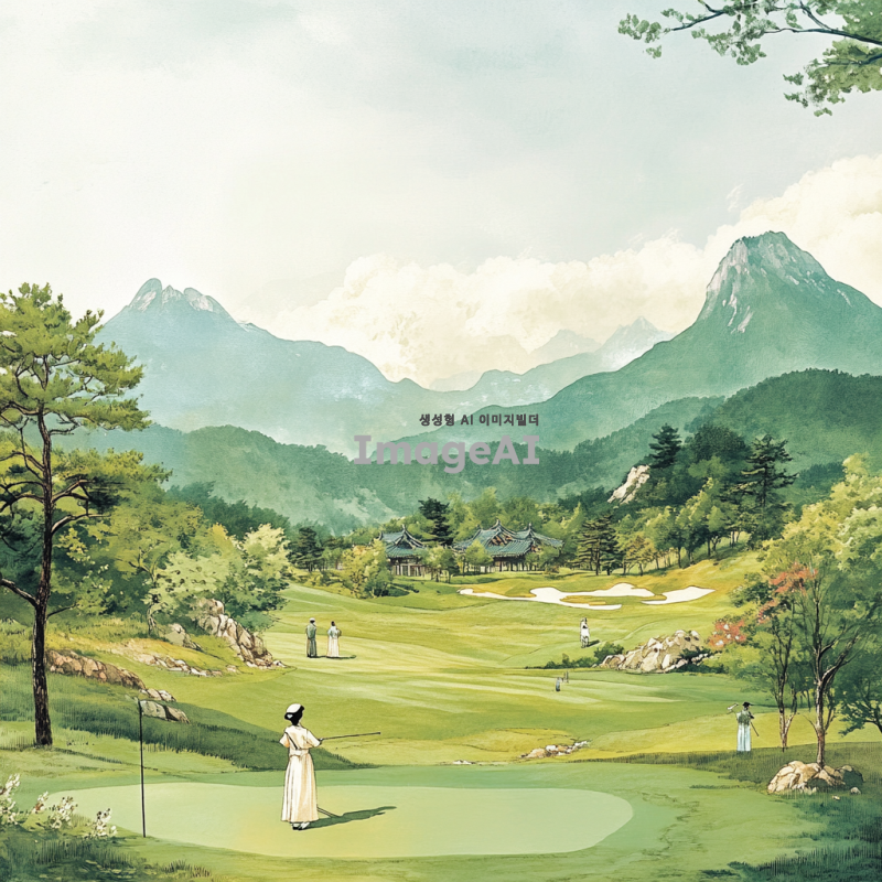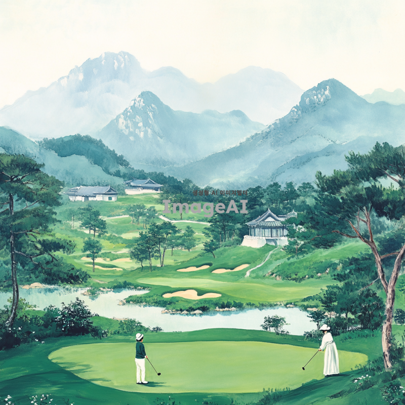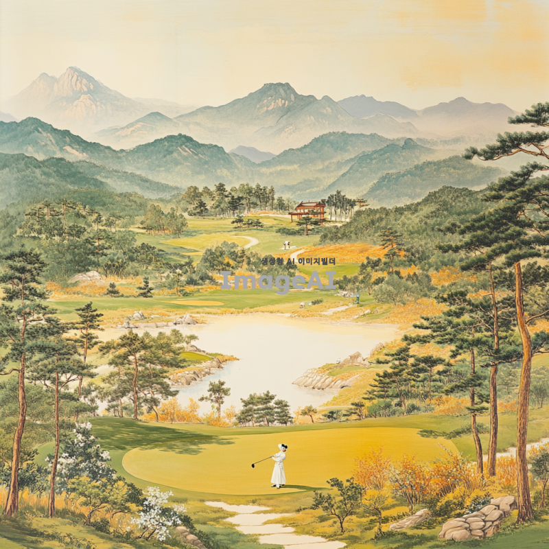 한국의 전통적인 동양화 스타일로 표현된 골프 장면, 푸른 산과 맑은 하늘을 배경으로 한 골프 코스, 고즈넉한 자연 속에서 골프를 즐기는 사람들, 붓으로 그린 듯한 부드러운 선과 색채, 전통 한복을 입은 인물이 골프 클럽을 휘두르는 모습, 고풍스러운 분위기의 자연 경관과 조화로운 골프 장면, 한국의 사계절을 반영한 골프 코스, 전통적인 동양화의 미학을 살린 아름다운 풍경과 골프의 조화.