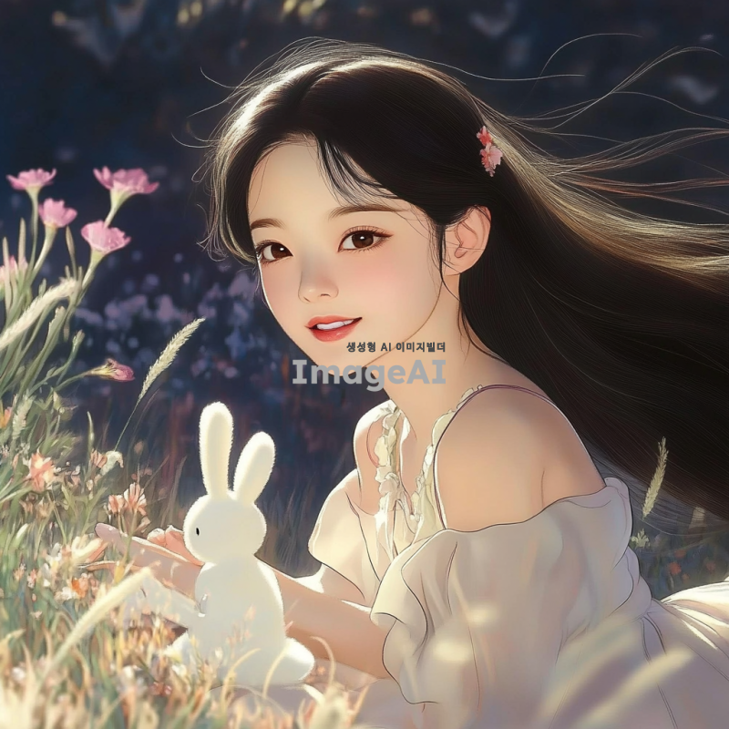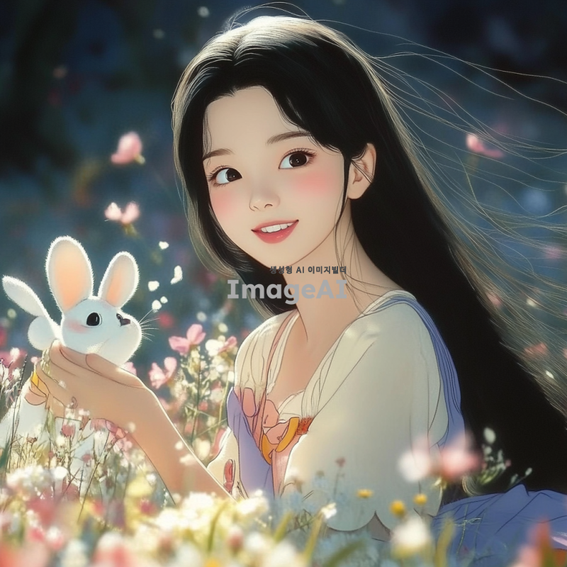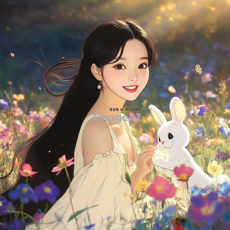 아름다운 한국 소녀, 긴 검은 머리, 맑고 빛나는 눈, 자연스러운 미소, 화사한 봄날의 꽃밭 배경, 부드러운 파스텔 색조의 드레스, 따뜻한 햇살이 비치는 장면, 부드러운 바람에 흩날리는 머리카락, 평화롭고 행복한 분위기.
