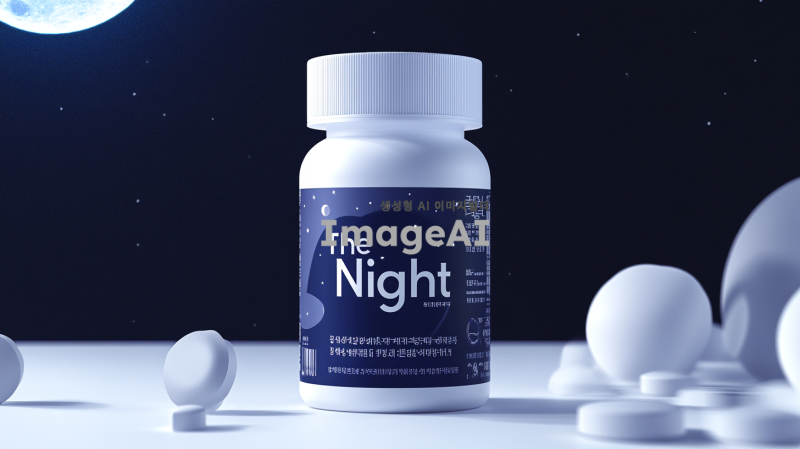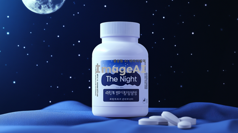 1️⃣ 수면 보조제의 검정색과 파란색 라벨이 있는 흰색 플라스틱 병, 제품 사진, 스티커에 "The Night"라는 한글 텍스트가 있는 정면 뷰, 달빛 배경, 광고 포스터, 한국 디자인 스타일, 각 정제가 twoumpotmilianpiredta 분말을 포함한 360g 병 크기