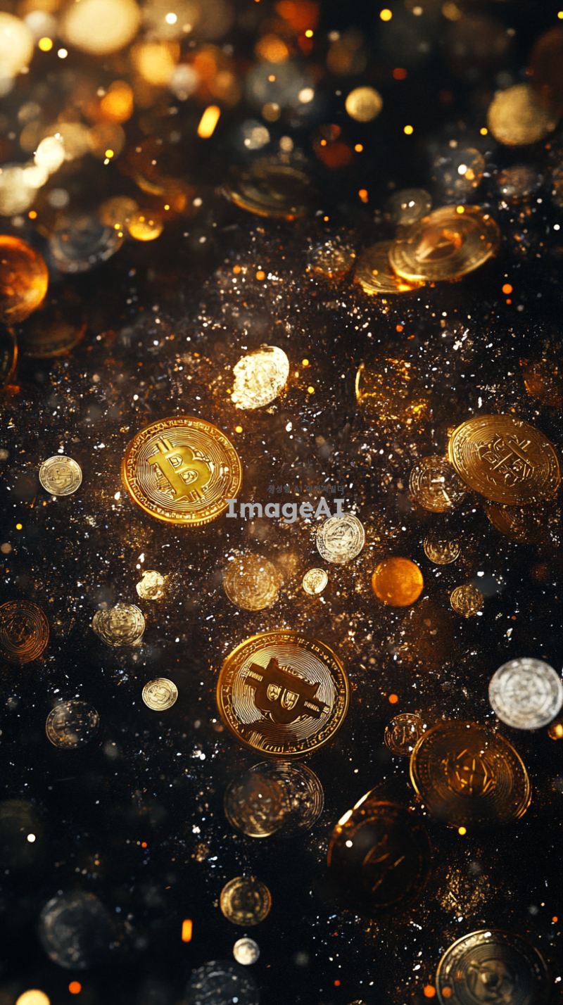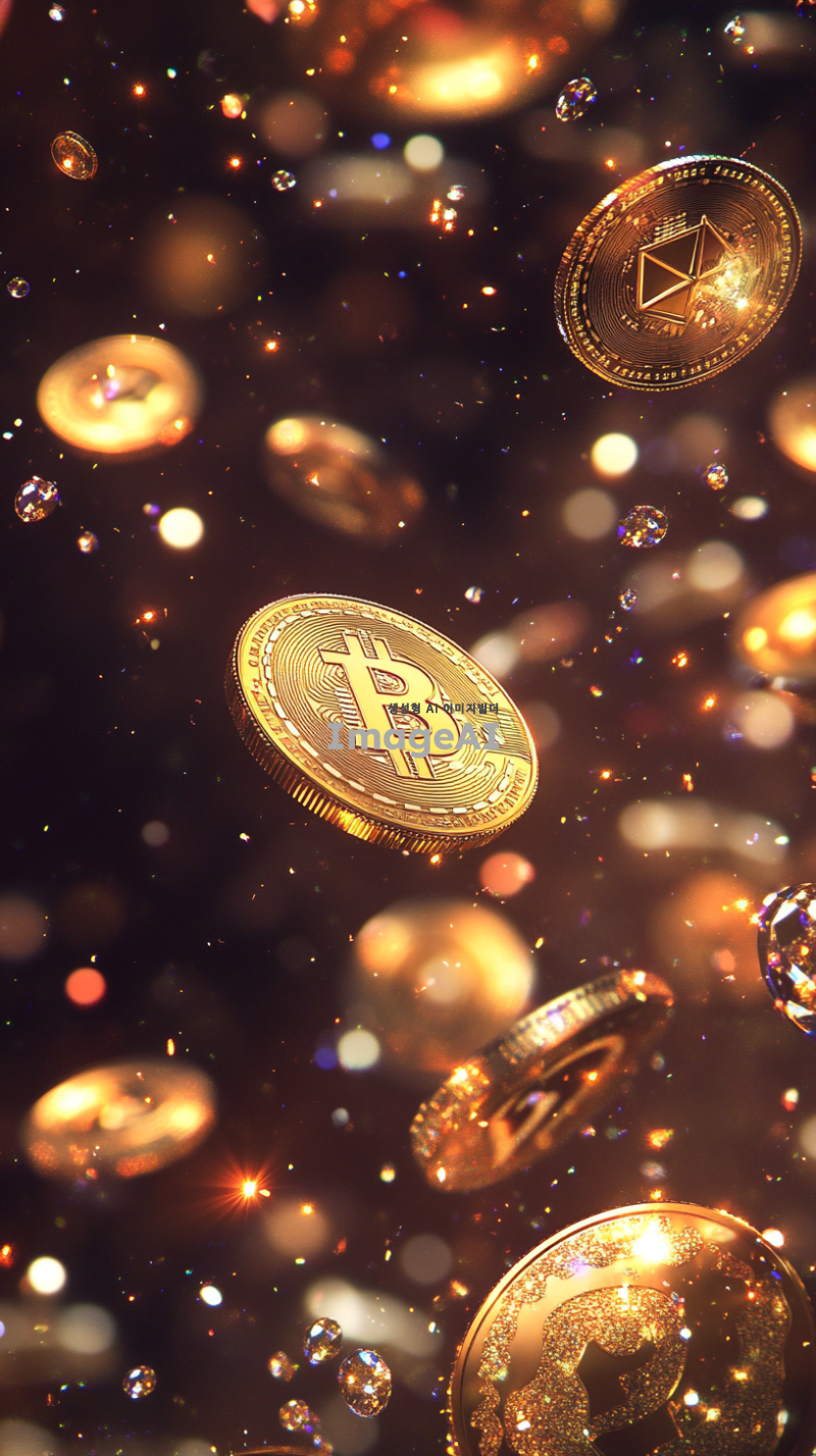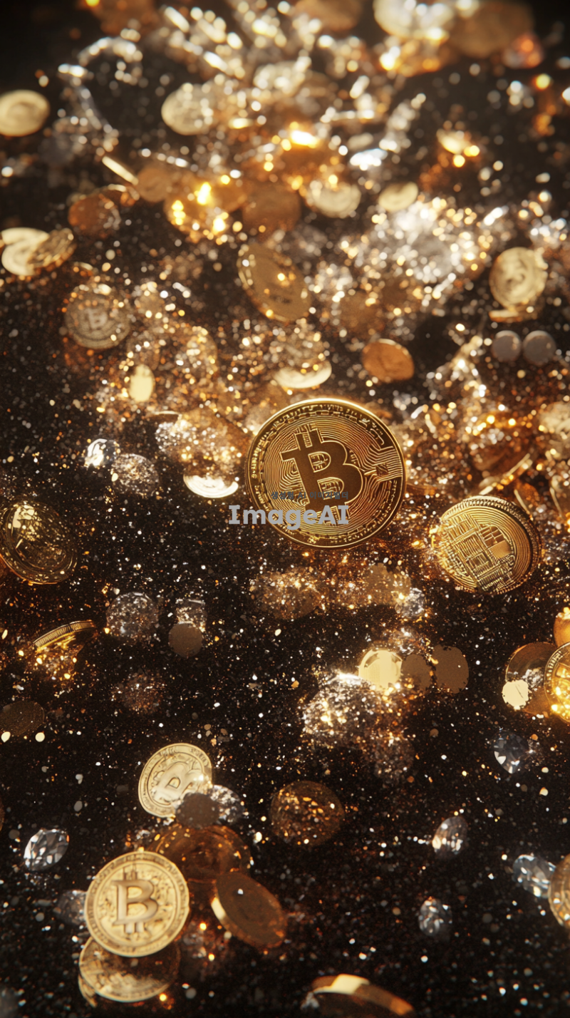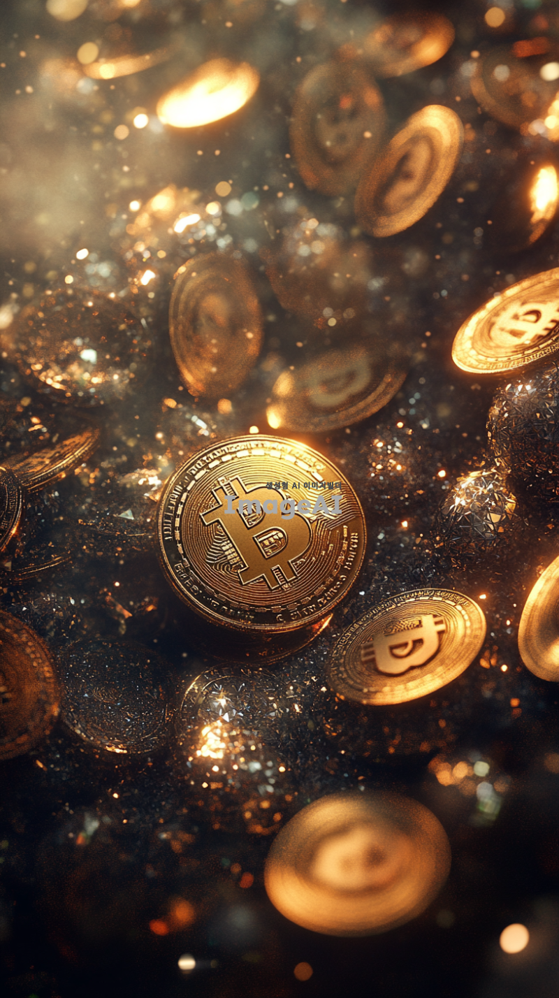 어두운 배경 위에 반짝거리는 비트코인 동전들이 흩어져 있고, 주변에는 빛나는 금은보화가 가득 쌓여 있는 모습. 비트코인은 황금빛으로 빛나고, 금은보화는 다양한 크기의 금화와 은화, 보석들이 섞여 있으며, 빛을 반사해 더욱 화려하게 보이는 장면. 조명은 부드럽고 은은하게, 반짝임이 강조되도록 설정.