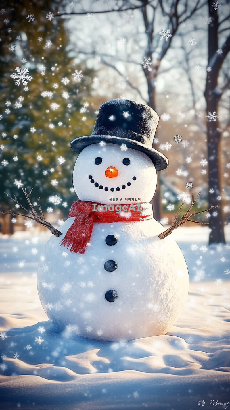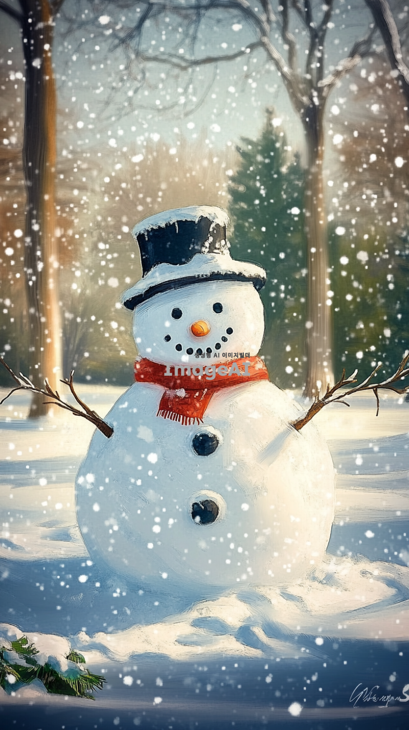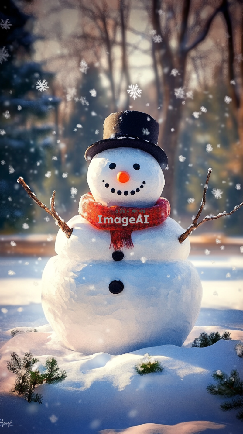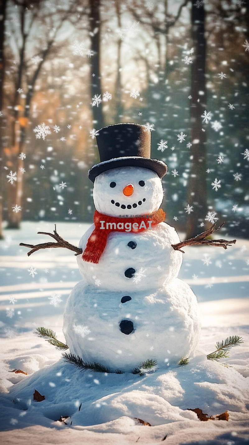 겨울철 눈 덮인 숲속에 서 있는 귀여운 눈사람, 밝은 빨간색 목도리와 검은 모자를 쓰고 있음, 눈으로 만든 동그란 몸과 나뭇가지 팔, 웃고 있는 얼굴, 주변에는 하얀 눈송이가 천천히 내리고 있는 장면, 부드럽고 따뜻한 조명, 겨울의 평화로운 분위기 강조.
