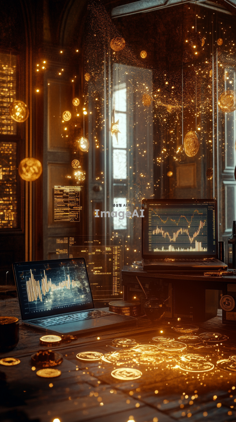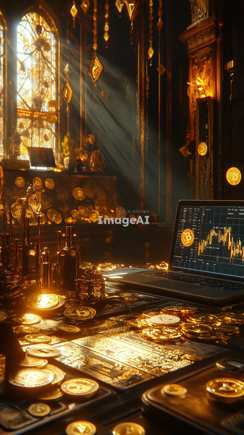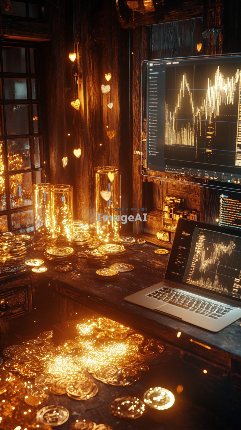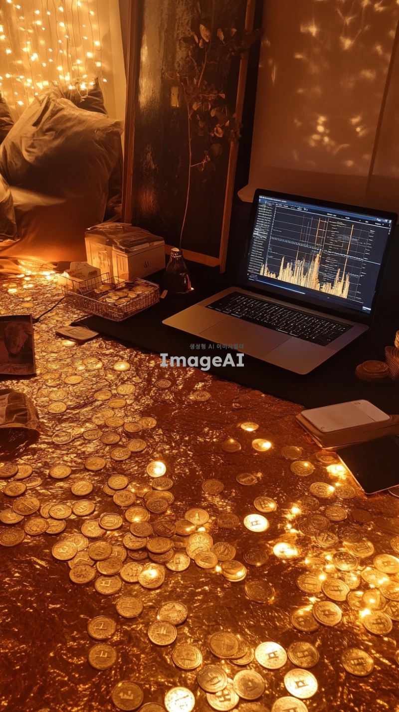 황금빛이 가득한 방 안에 다양한 금은보화들이 빛나고 있다. 바닥에는 여러 개의 코인 차트가 흩어져 있으며, 각각의 차트는 다양한 암호화폐의 그래프를 보여준다. 방 한쪽에는 노트북이 놓여 있고, 화면에는 급상승한 코인 차트가 선명하게 표시되어 있다. 빛나는 금은보화와 차트들로 인해 방 안은 화려하고 번쩍이는 분위기를 자아낸다.