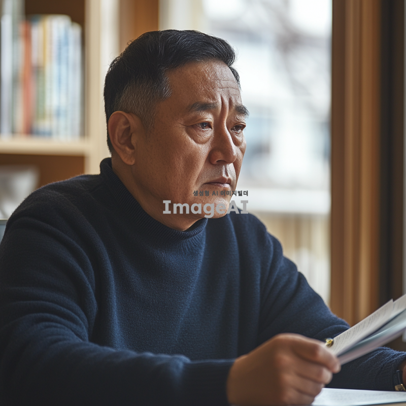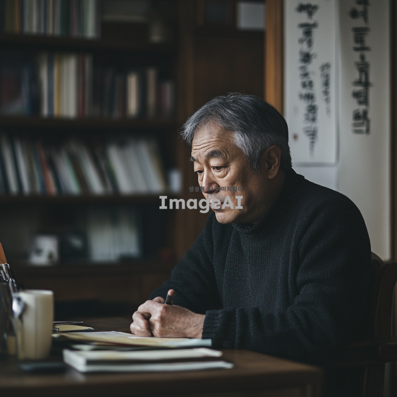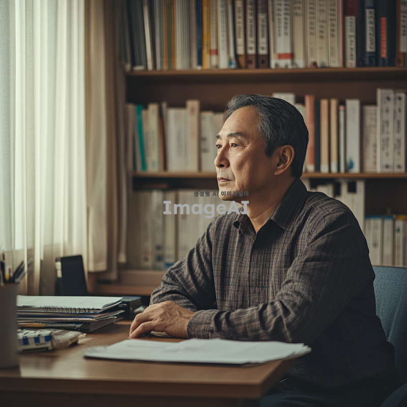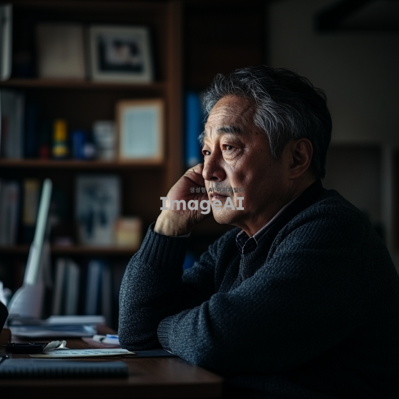 60대 한국인 남성이 조용한 방 안에서 책상에 앉아 깊은 고민에 잠긴 모습