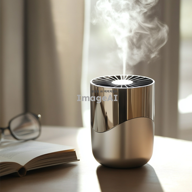 현대적인 디자인의 컵, 컵 가장자리에 작은 선풍기가 부착되어 있는 모습, 선풍기는 조용하게 작동하며 컵 안의 뜨거운 음료를 식히는 역할을 함, 컵은 세련된 금속 재질로 만들어져 있으며 반짝이는 표면, 음료는 김이 모락모락 나는 따뜻한 커피, 배경은 아늑한 실내 공간, 자연광이 부드럽게 들어오는 창문, 편안한 분위기의 인테리어, 컵 옆에는 책과 안경이 놓여 있는 장면.