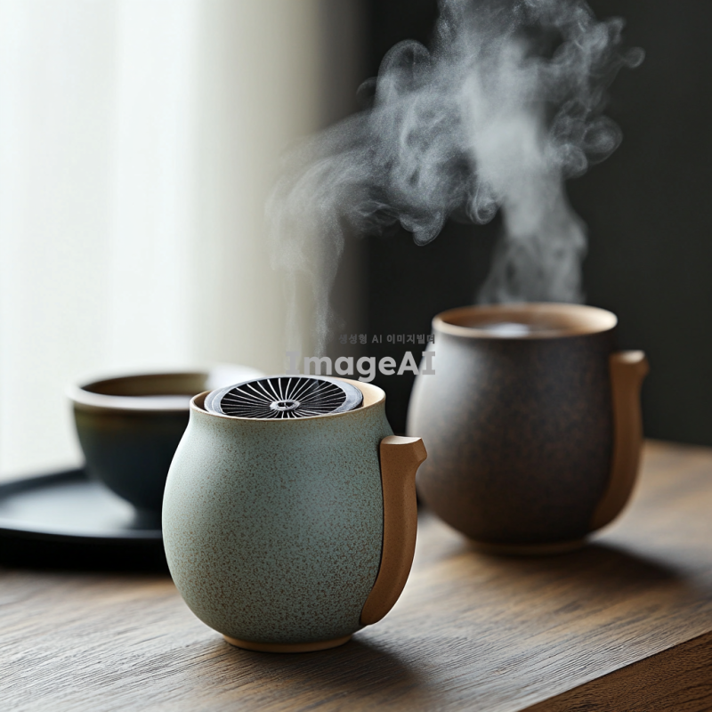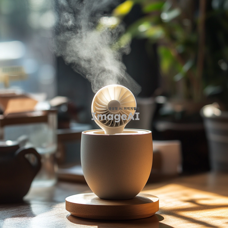 한국 전통 도자기 스타일의 컵, 손잡이에 작은 선풍기가 달려 있어 뜨거운 음료를 식혀주는 모습, 컵에는 따뜻한 김이 모락모락 피어오르고, 선풍기는 부드럽게 회전하며 바람을 일으키는 장면, 주변은 아늑한 카페 분위기, 나무 테이블 위에 놓인 컵, 자연광이 부드럽게 비치는 환경, 현대적이면서도 전통적인 디자인의 조화.