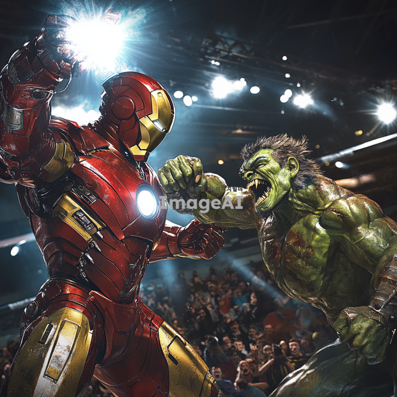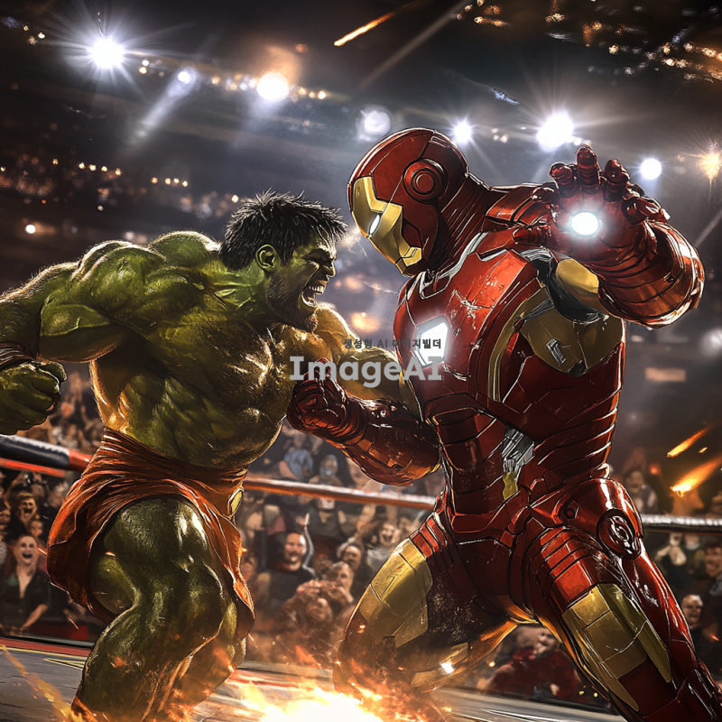 UFC 링 위에서 싸우는 장면, 아이언맨은 그의 고유한 금속 수트와 빨간색과 금색의 디자인을 입고 있으며, 고블린은 초록색 피부와 날카로운 이빨을 가진 모습으로 표현. 아이언맨은 그의 손에서 에너지를 발사하는 기술을 사용하고 있으며, 고블린은 민첩하게 회피하면서 반격을 준비하고 있는 동작. 링 주변에는 관중들이 열광적으로 응원하고 있으며, 조명이 강하게 비추고 있는 역동적인 경기 분위기. 현실적이고 세밀한 묘사로, 두 캐릭터의 동작이 생생하게 표현된 이미지.클래시로얄에 등장하는 고블린의 이미지와 비슷하게