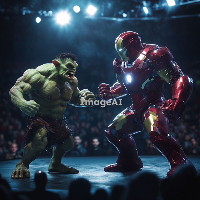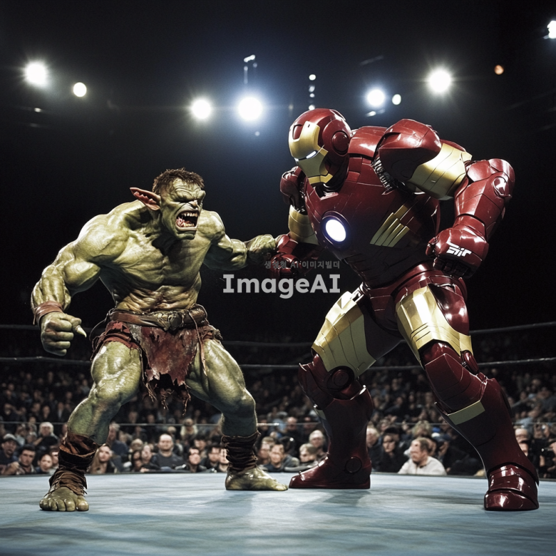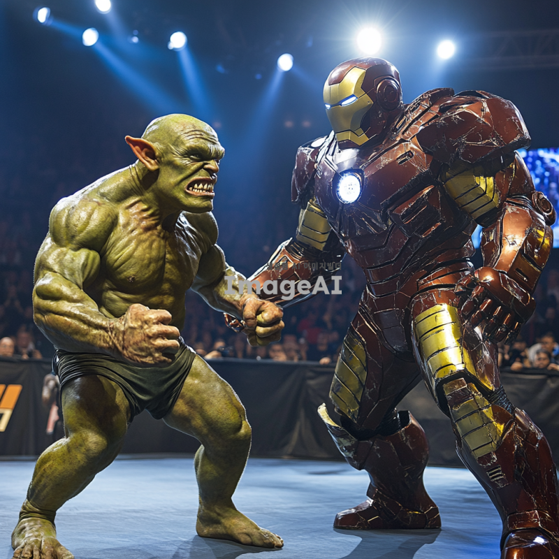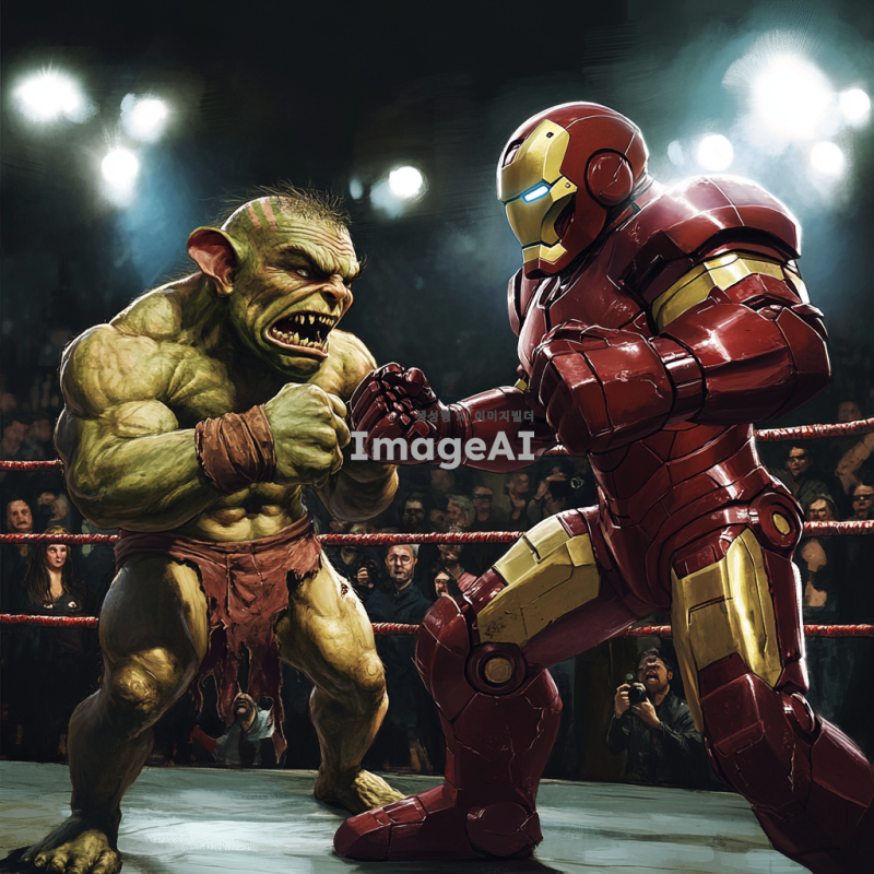 UFC 링 위에서 격투기하는 모습, 한쪽에는 못생긴 고블린이 있고, 다른 쪽에는 강력한 아이언맨이 있다. 고블린은 초록색 피부와 날카로운 이빨을 가지고 있으며, 작고 왜소한 체형으로 긴장한 표정을 짓고 있다. 아이언맨은 강력한 메탈 수트를 입고 있으며, 자신감 넘치는 포즈를 취하고 있다. 링 주위에는 관중들이 흥미진진하게 경기를 지켜보고 있으며, 조명은 두 전투자에게 집중되어 있다. 고블린이 질 확률이 높아 보이는 상황을 표현. 또한 고블린은 클래시로얄에 등장하는 고블린이라는 캐릭터와 거의 비슷하게