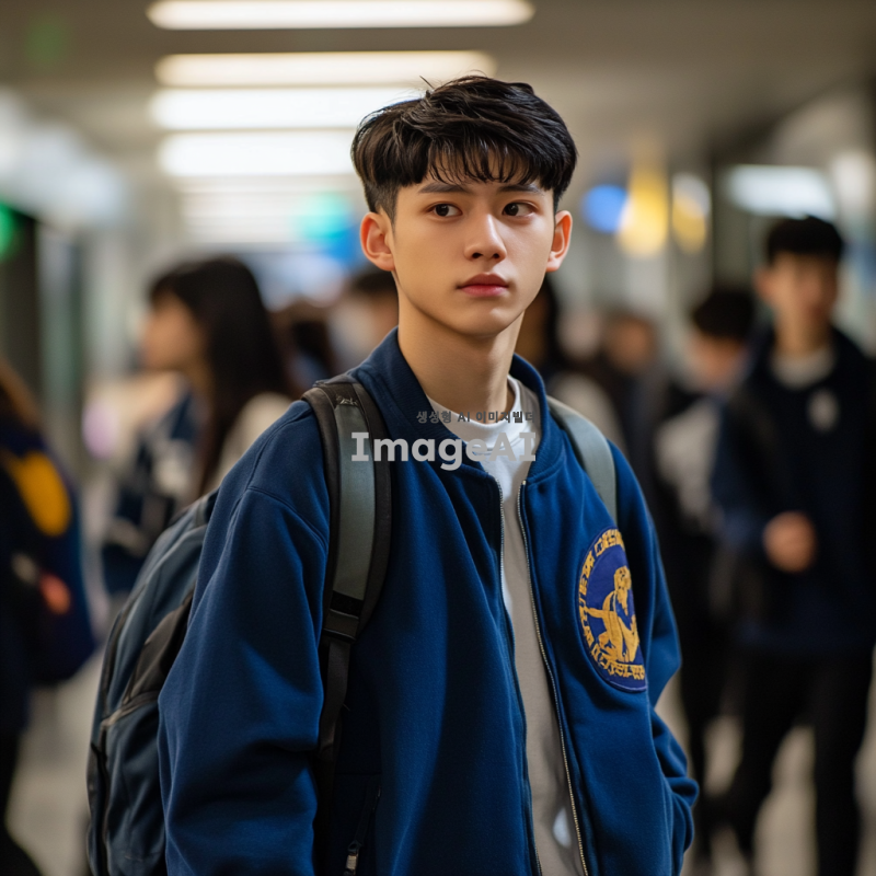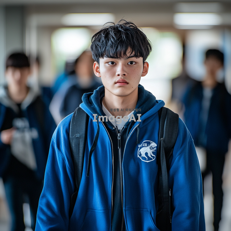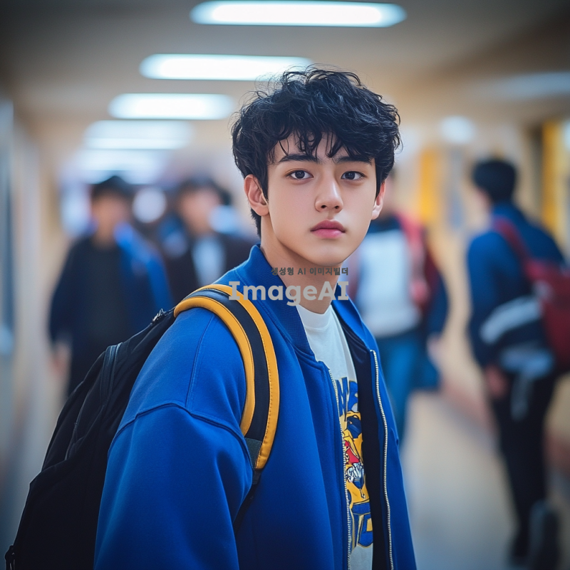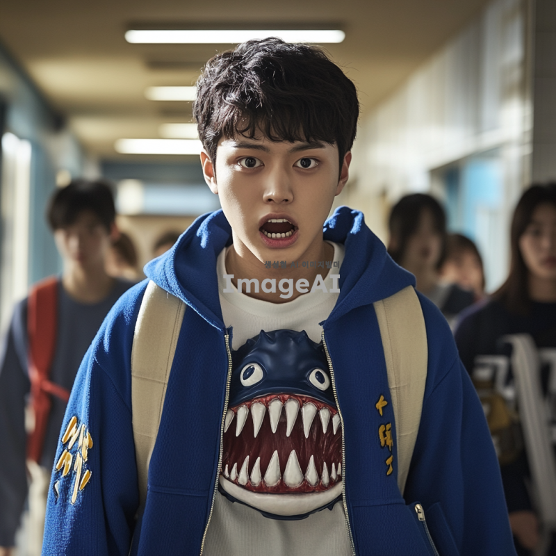 몬스터 물고기를 닮은 얼굴, 파란 바시티 자켓을 입고 있는 반포고등학교 1학년 남학생, 한국인, 학교 복도에서 걸어가는 모습, 약간 긴장한 표정, 주변에 다른 학생들이 지나가는 배경, 자연스러운 조명, 현실적이고 생생한 분위기