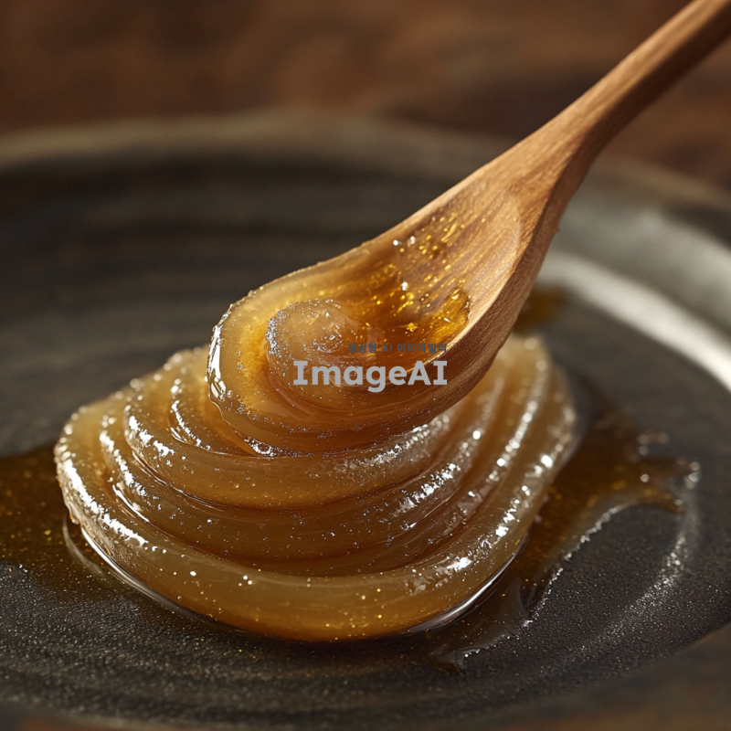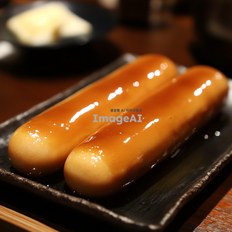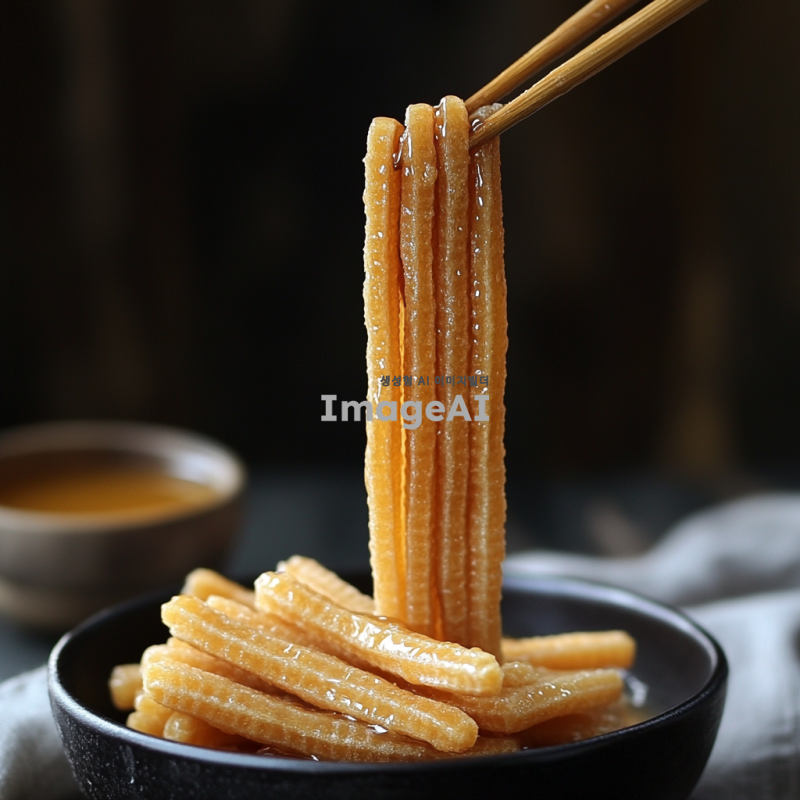 한국 전통 가래떡이 황금빛 허니버터 소스로 윤기 있게 코팅되어 있는 모습. 가래떡은 길고 매끄러운 형태로, 달콤한 버터의 향기가 느껴질 듯한 비주얼. 허니버터 소스는 반짝이는 꿀과 부드러운 버터가 조화롭게 어우러져 있으며, 가래떡 위에 고루 퍼져 있는 모습..