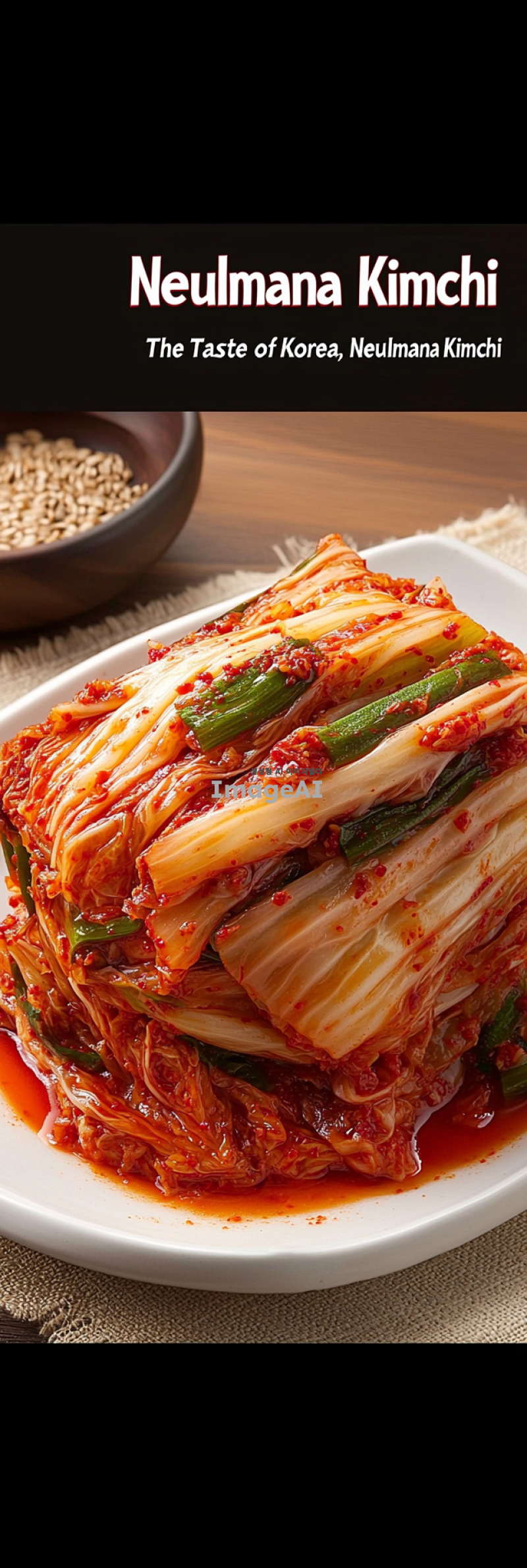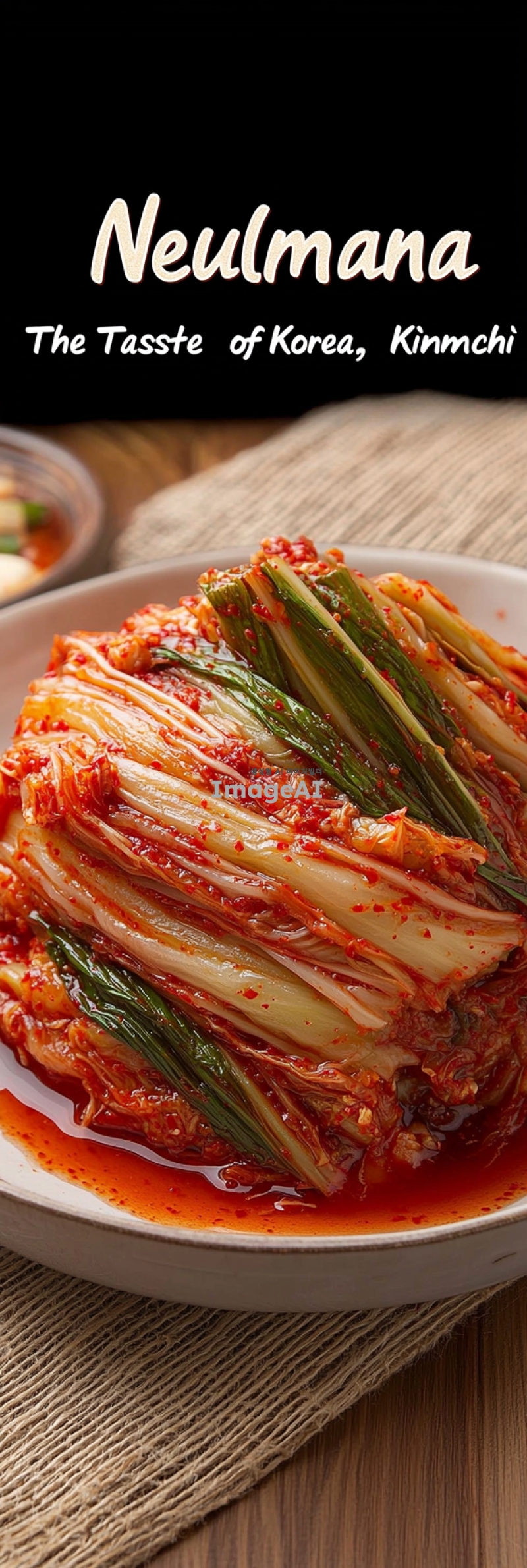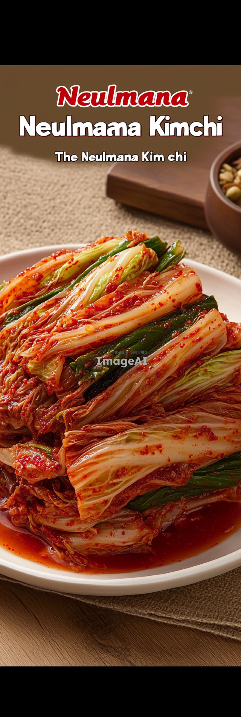 한국 전통 포기김치를 강조하는 광고 이미지. 신선하고 선명한 색상의 김치가 접시에 담겨 있으며, 배경은 따뜻하고 가정적인 분위기를 연출. 김치의 풍부한 양념과 식감이 잘 드러나도록 클로즈업. 이미지 상단에 "늘만나김치"라는 타이틀이 한국 전통 서체로 삽입되어 있으며, 타이틀은 붉은색과 녹색을 사용해 김치의 색감을 반영. 타이틀 아래에는 "한국의 맛, 늘만나김치"라는 문구가 작은 글씨로 추가되어 있음.