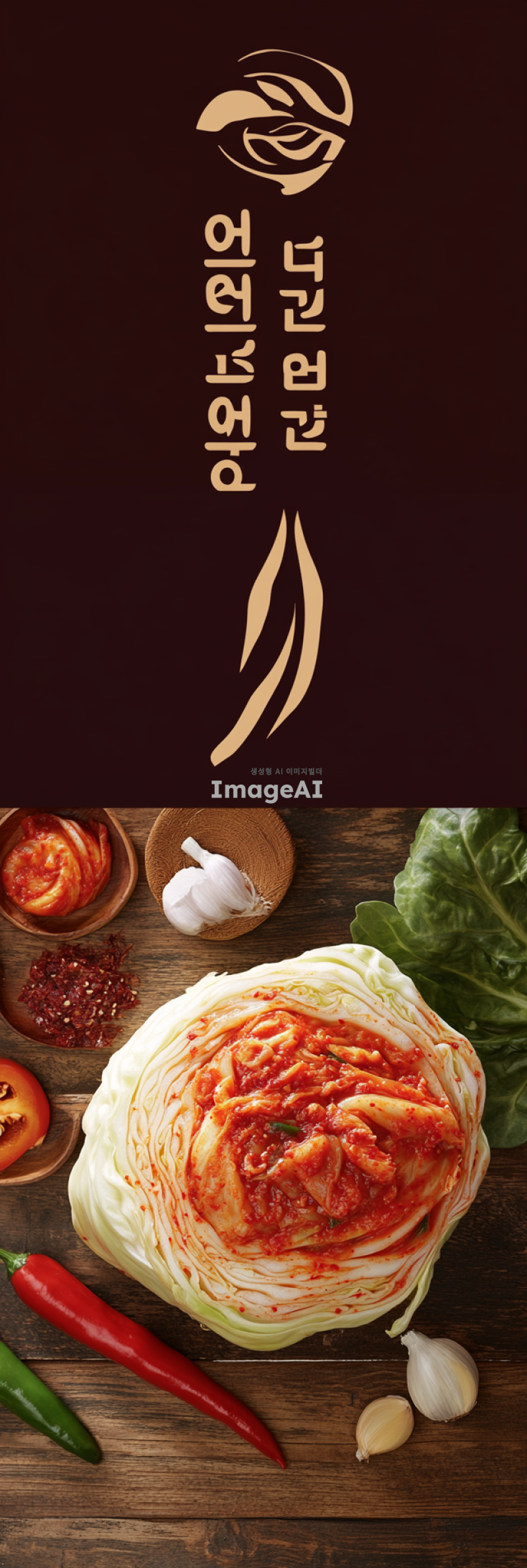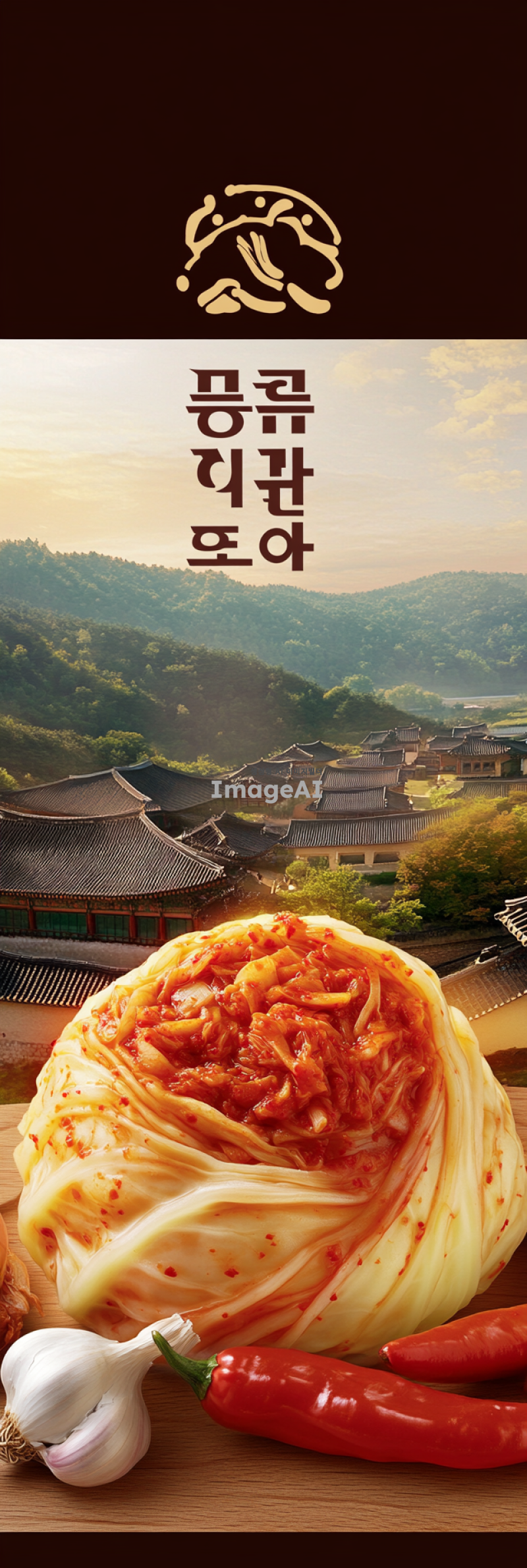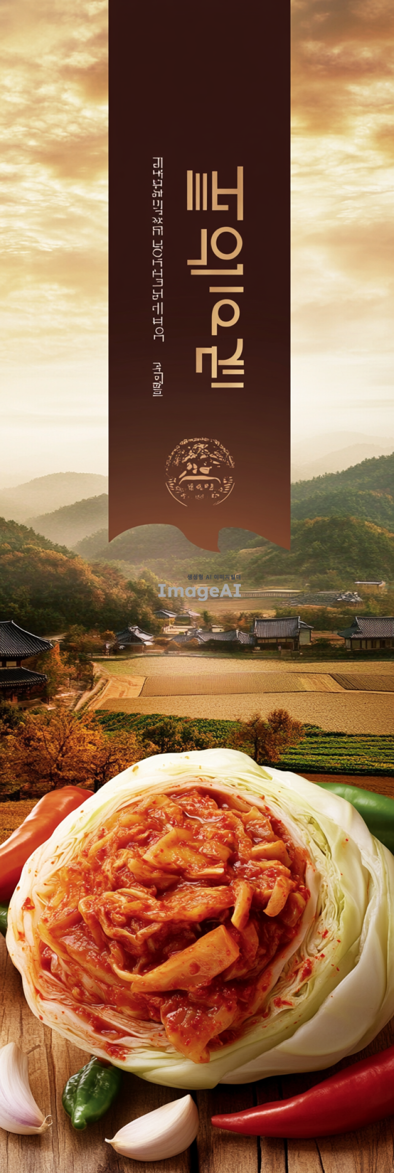 한국의 전통적인 농촌 풍경을 배경으로, 농업회사법인 늘만나식품(주)의 로고가 잘 보이게 배치된 포기김치가 중심에 놓인 이미지. 신선하고 맛있어 보이는 김치가 강조되며, 주변에는 잘 익은 배추와 고추, 마늘 등의 김치 재료들이 자연스럽게 배치되어 있어야 한다. 따뜻하고 친근한 느낌을 주는 색감으로, 전통과 현대가 조화를 이루는 분위기를 연출.