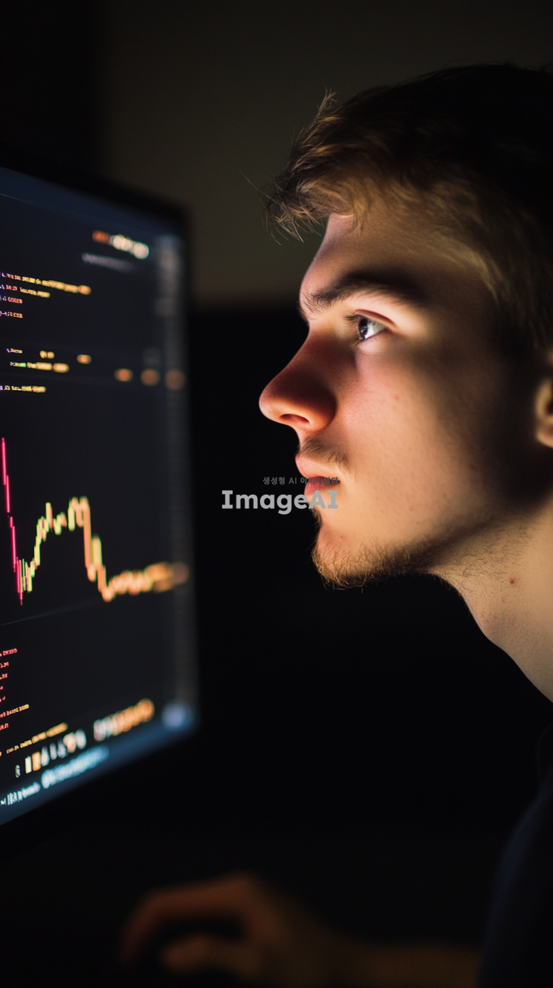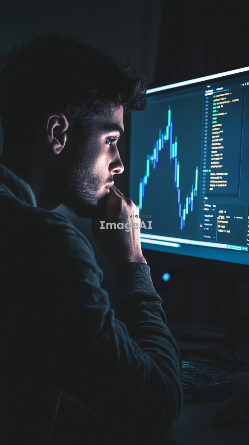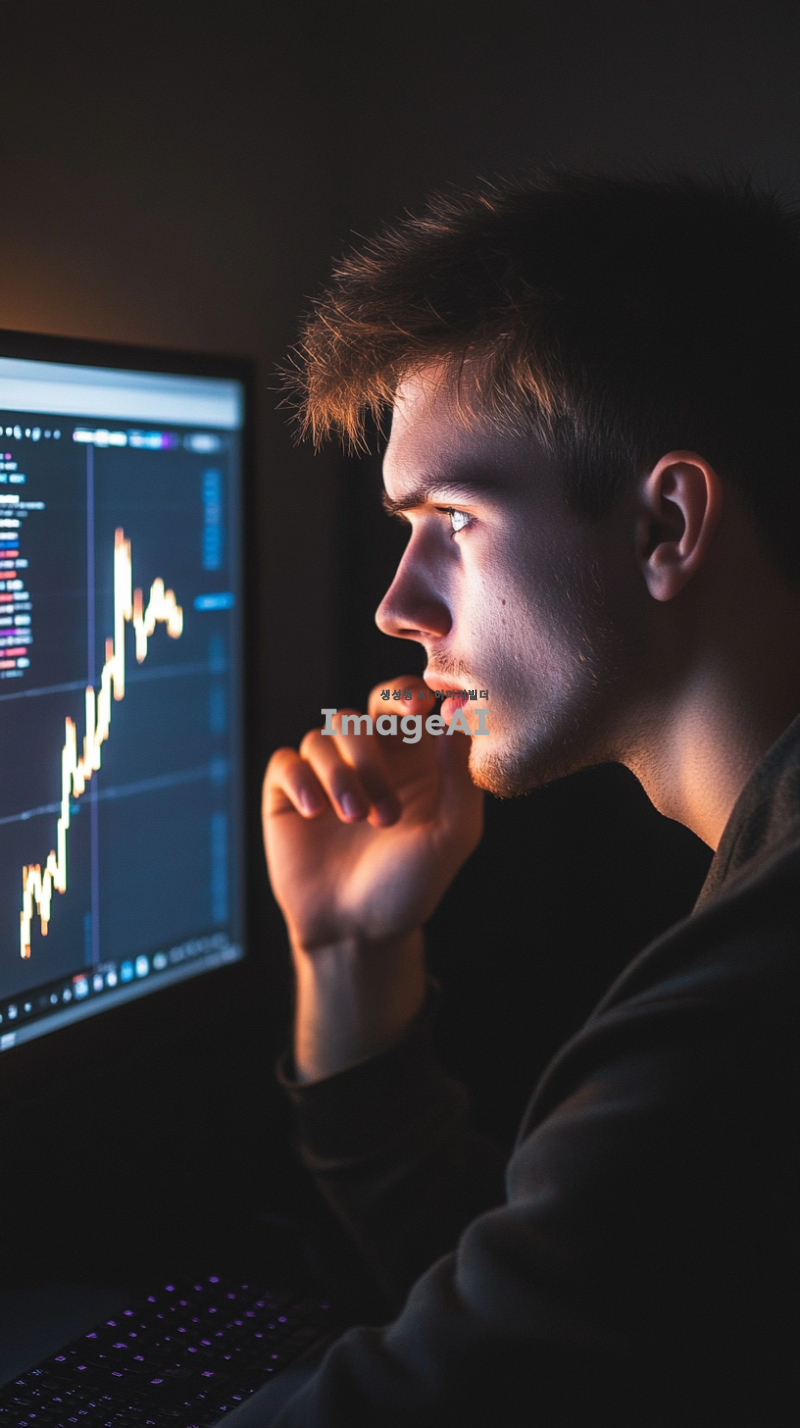 어두운 방 안에서 컴퓨터 화면을 바라보며 아쉬워하는 젊은 남성, 화면에는 급등하는 코인 차트가 표시되어 있음, 남성의 표정은 아쉬움과 후회가 섞인 복잡한 감정, 방 안에는 차가운 조명 아래에서 반사되는 화면 빛이 남성의 얼굴을 비추고 있음