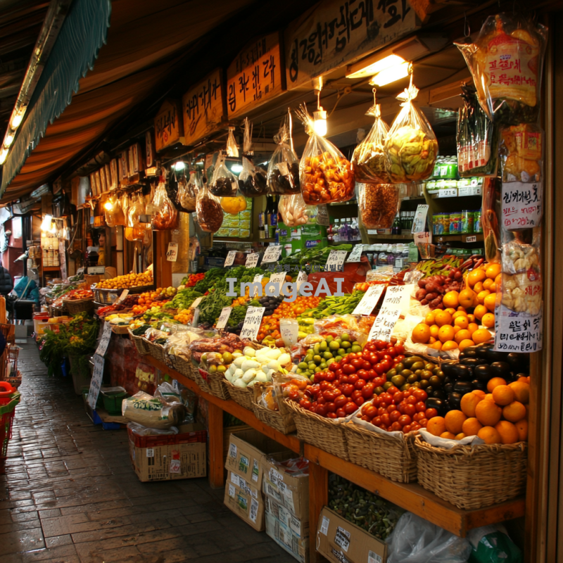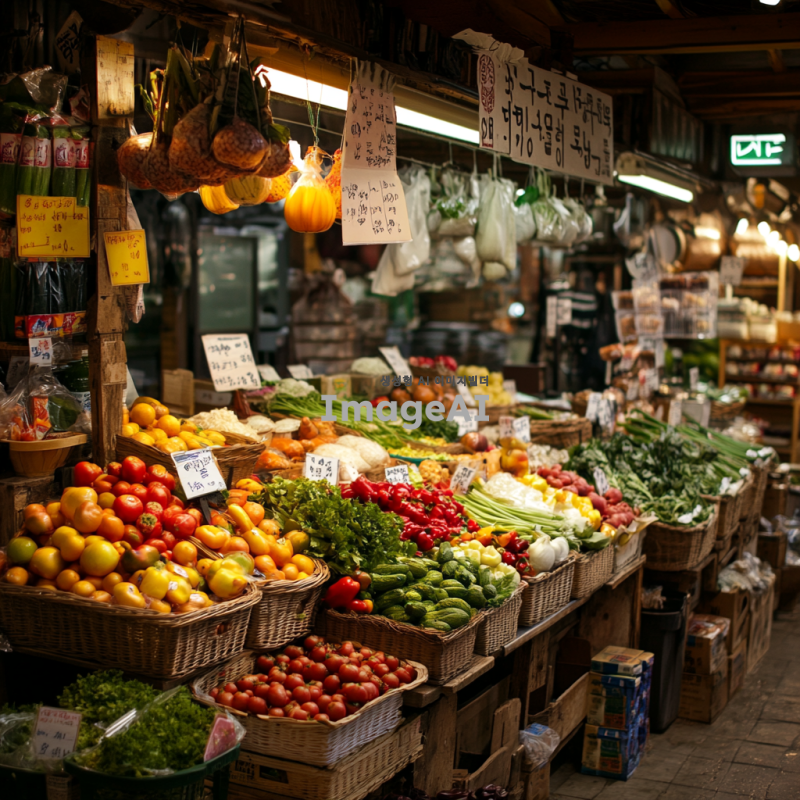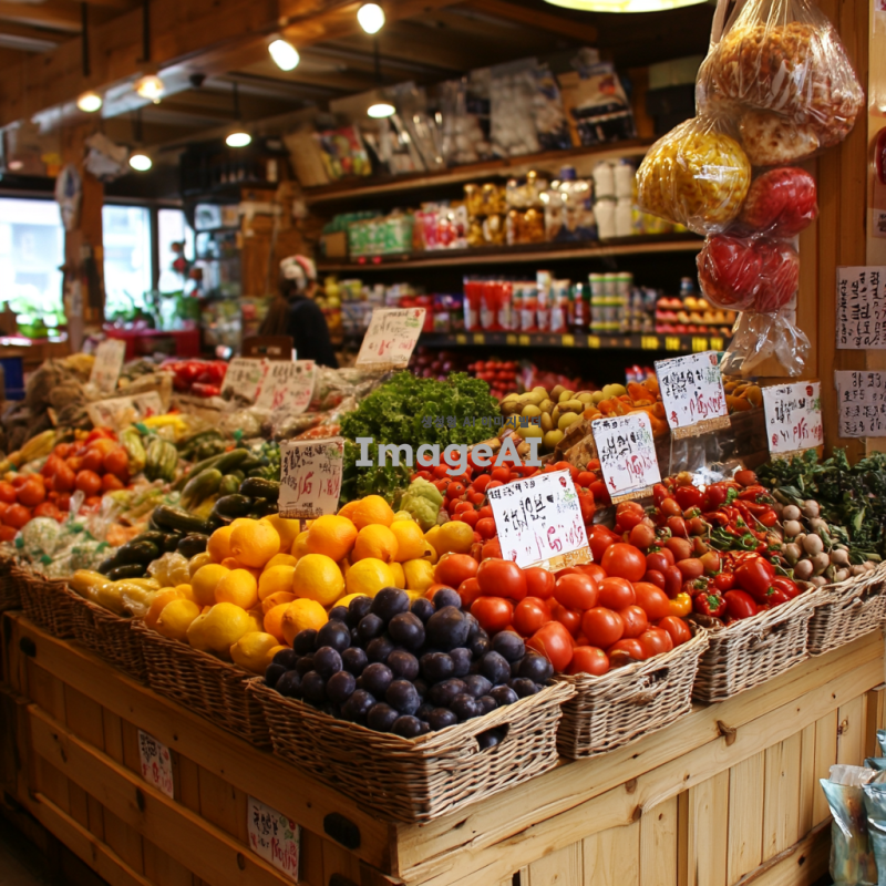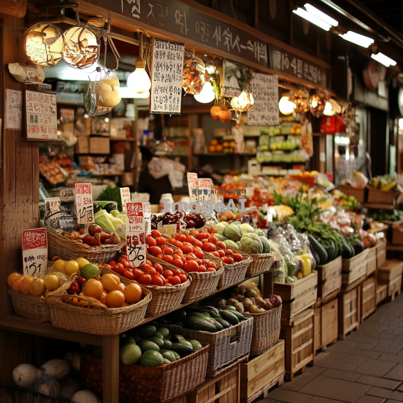 한국 전통 시장의 식료품 가게, 다양한 채소와 과일이 진열된 모습, 신선한 채소와 과일의 생생한 색감, 나무로 된 진열대와 바구니에 자연스럽게 놓인 식료품들, 따뜻하고 친근한 분위기, 시장 특유의 활기찬 느낌, 전통적인 한국 시장의 매력을 강조