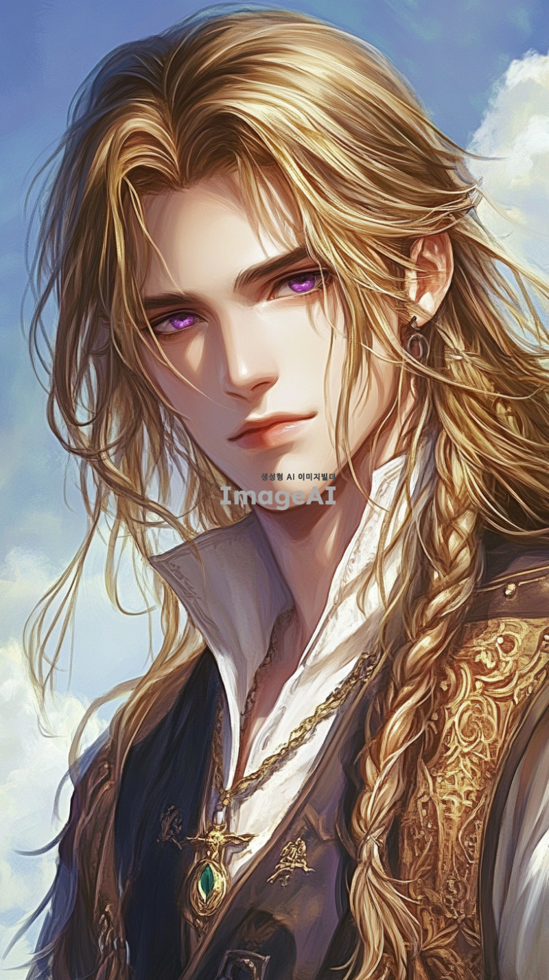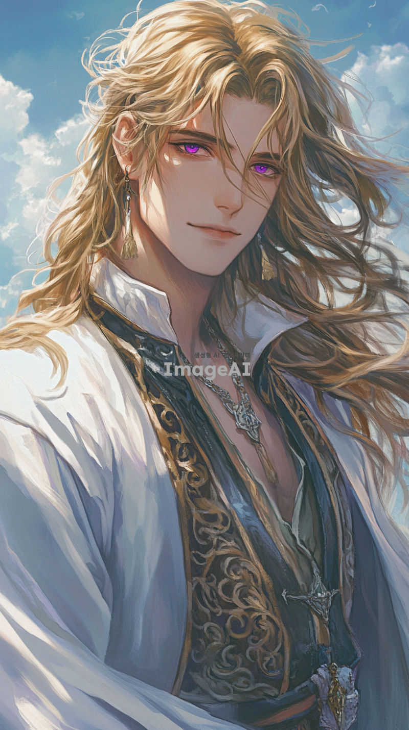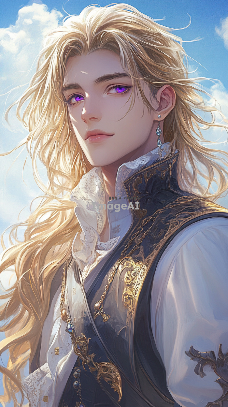 애니메이션 스타일의 긴 머리를 가진 미소년, 부드러운 바람에 머리카락이 흩날리는 모습, 큰 눈과 섬세한 얼굴 특징, 푸른 하늘 배경, 밝고 생동감 있는 색감, 중세풍의 귀족 의상, 자연스러운 포즈, 청량한 분위기. 보랏빛 눈에 밝은 금발