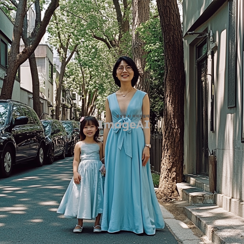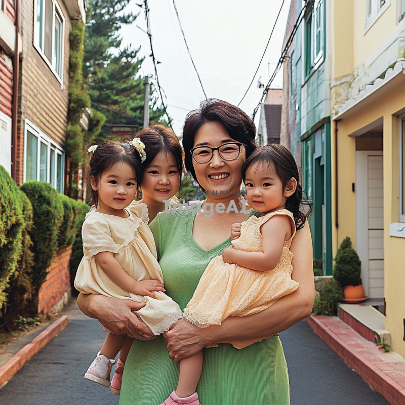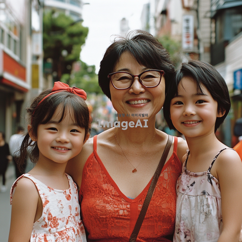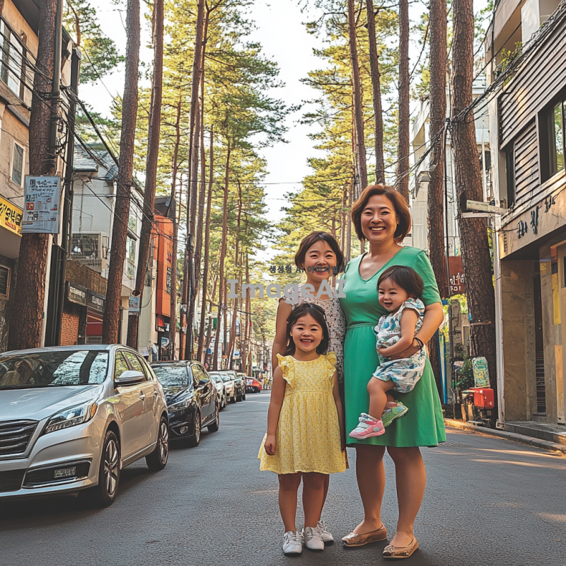 서울 강남의 아름다운 거리, 압구정의 세련된 분위기를 배경으로, 75년 안산 출생의 중년 한국 여성. 그녀는 스타일리시한 옷을 입고 있으며, 옆에는 두 딸과 남편이 함께 서 있다. 가족 모두 행복한 미소를 짓고 있으며, 주변에는 현대적인 건물과 푸른 나무들이 어우러져 있다. 밝고 활기찬 분위기의 장면.