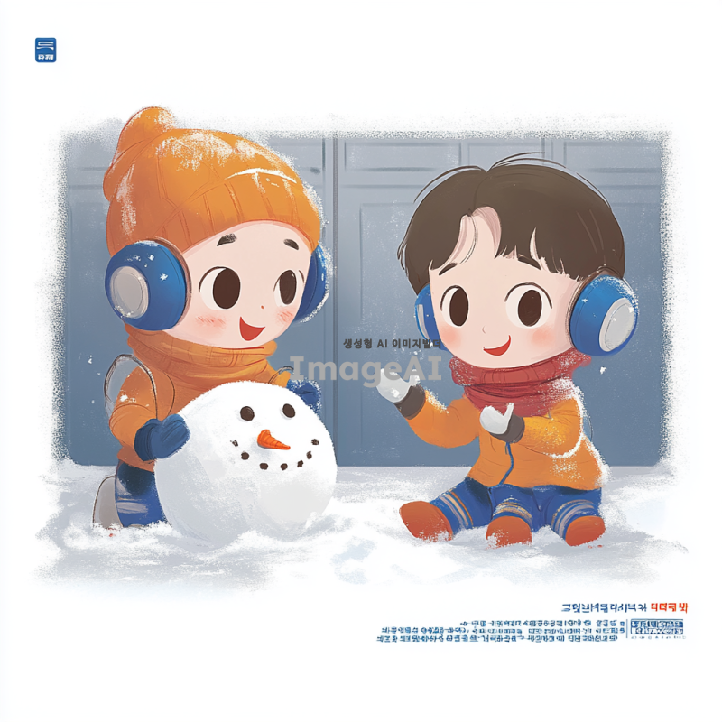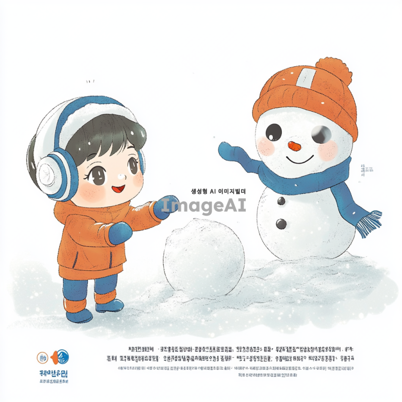 안전이 캐릭터가 눈사람을 만들기 위해 눈을 굴리고 있고, 행복이는 이를 지켜보고 있다. 안전이는 귀마개를 했고, 행복이는 목도리를 했다.