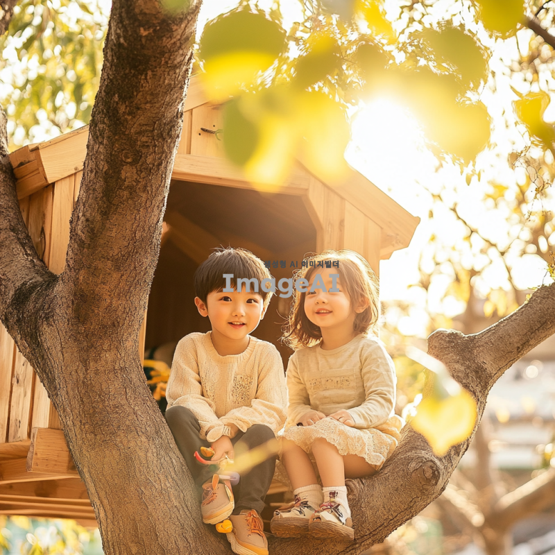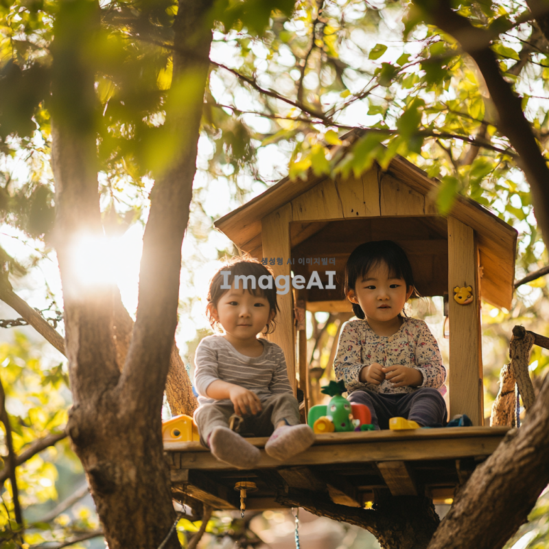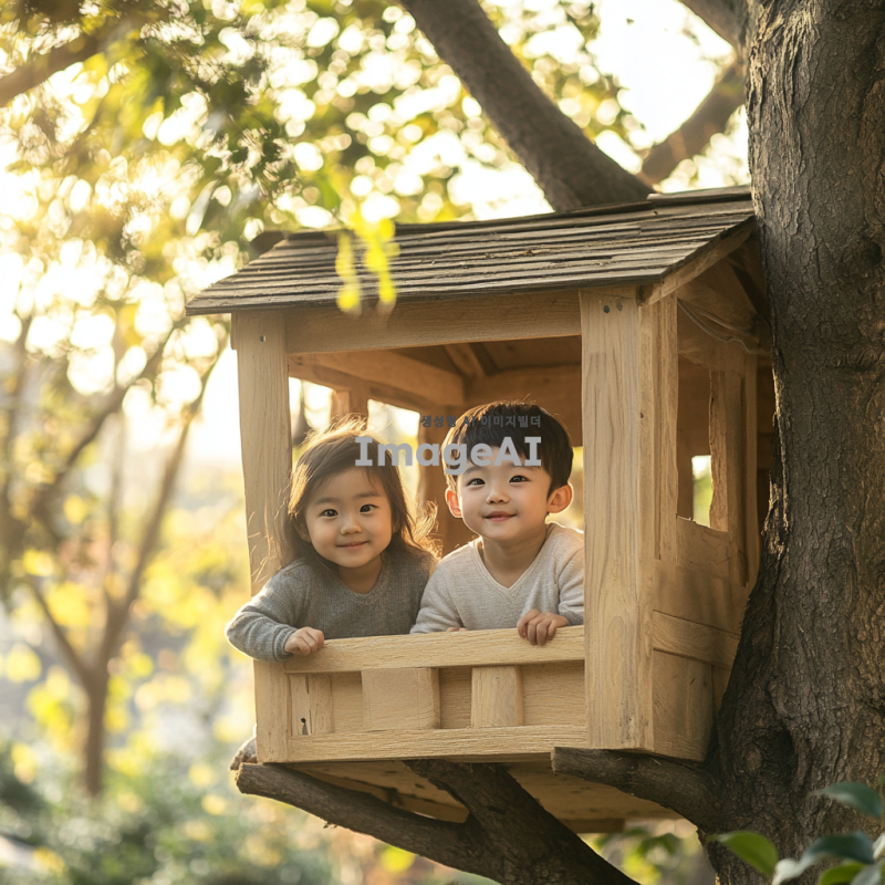 나무 위에 있는 아늑한 나무집에서 두 명의 귀여운 한국인 아이들이 함께 놀고 있는 모습, 아이들은 밝고 즐거운 표정으로 나무집 주변에 있는 작은 장난감과 자연을 탐험하며 즐거운 시간을 보내고 있다, 따뜻한 햇살이 나무 사이로 비추고, 주변에는 푸른 잎사귀와 자연의 색감이 가득하다, 아이들은 캐주얼한 옷을 입고 있으며, 나무집은 나무와 자연에 잘 어우러지는 디자인이다, 전체적으로 평화롭고 행복한 분위기가 느껴진다.